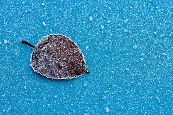 La hoja está cubierta de escarcha congelada, se encuentra sobre un fondo azulLa hoja está cubierta de escarcha congelada, se encuentra sobre un fondo azul