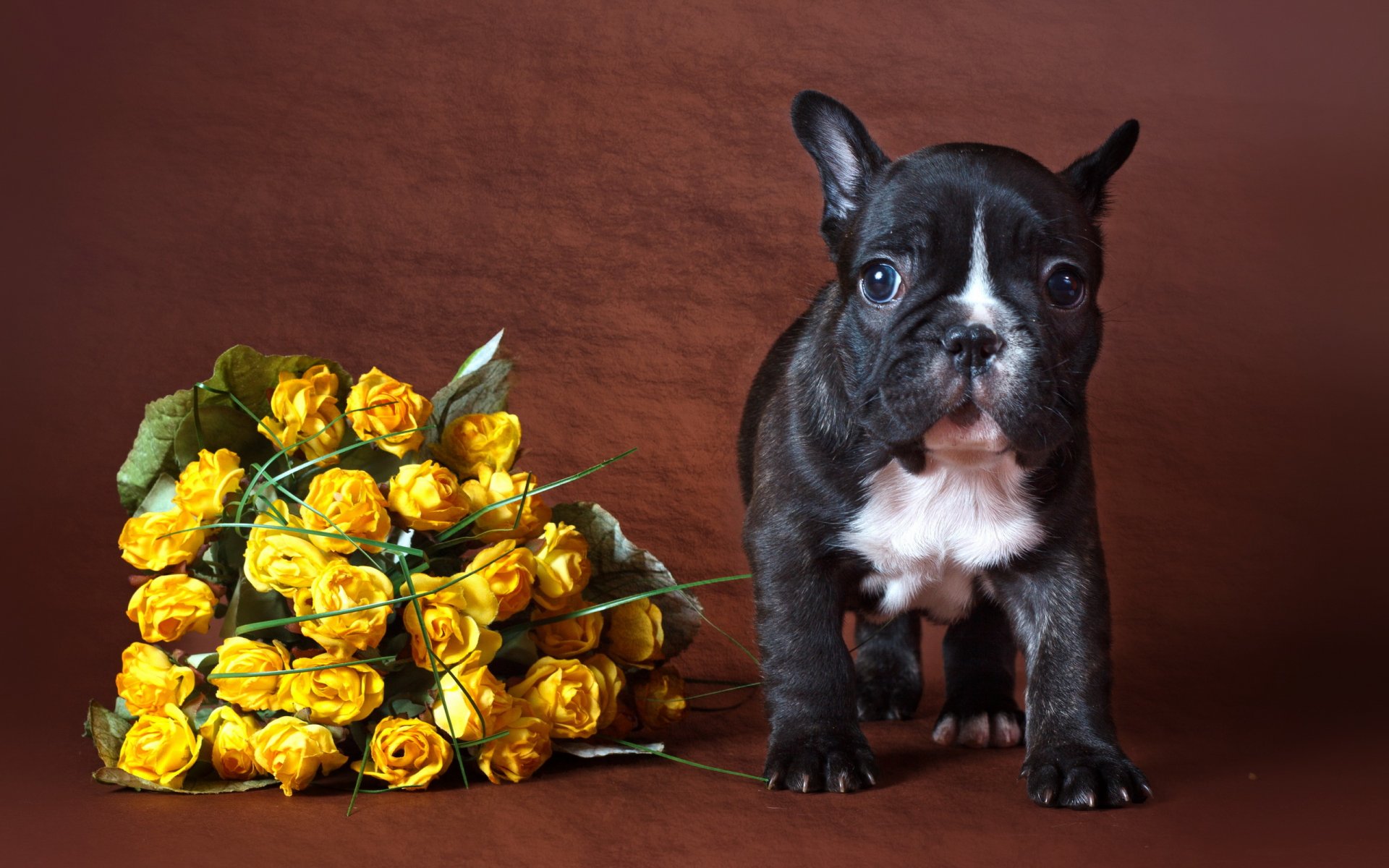 Lindo cachorro cerca de un ramo de rosas amarillas