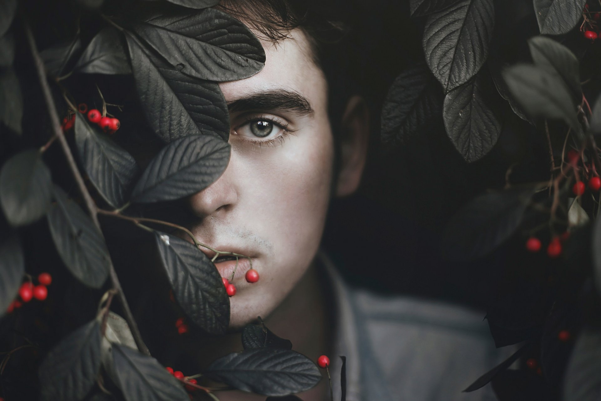 Parent mira desde detrás de un árbol con bayas rojasParent Mira desde detrás de un árbol con bayas rojas