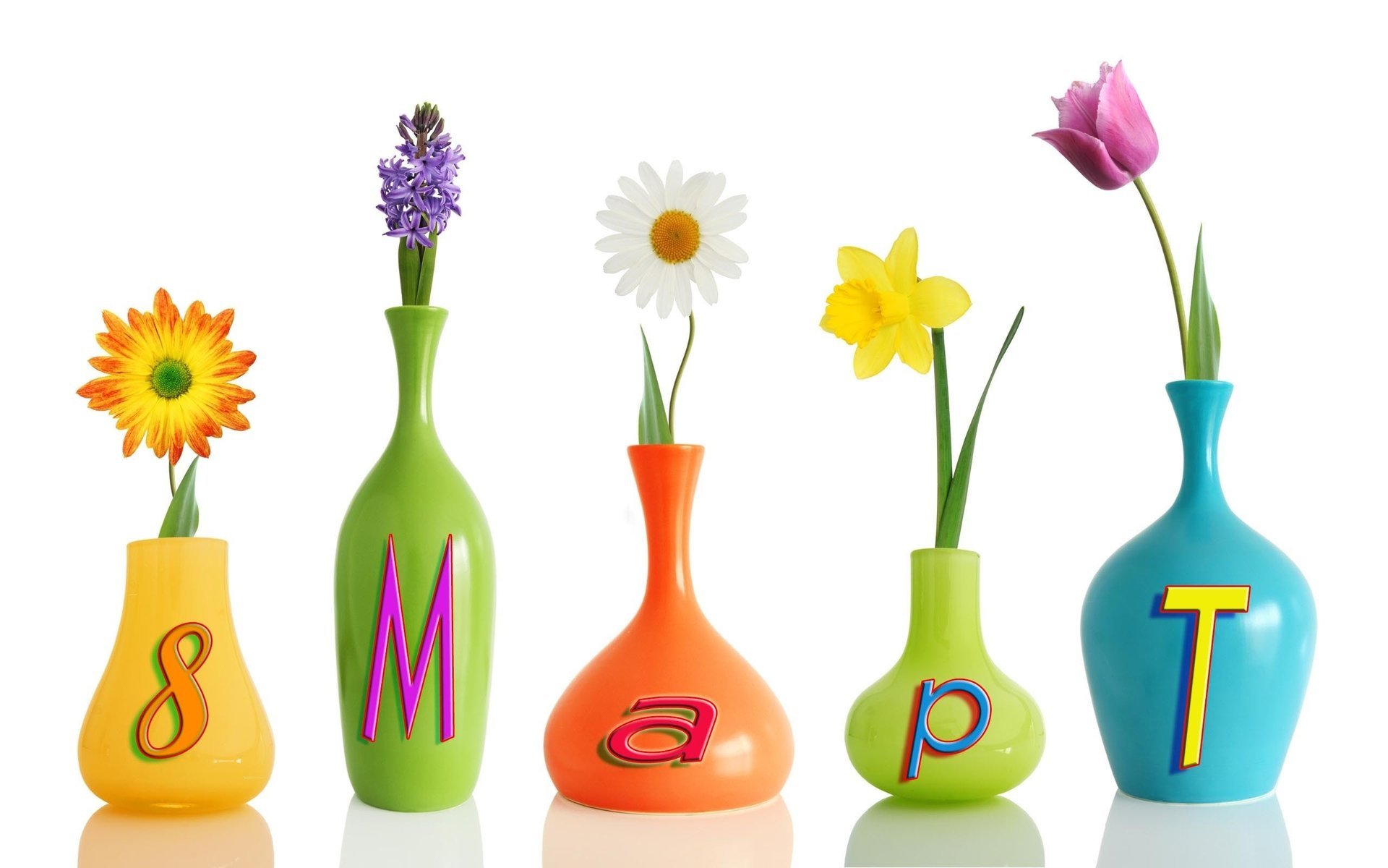 Cinco jarrones de diferentes colores y tamaños. En cada florero una flor