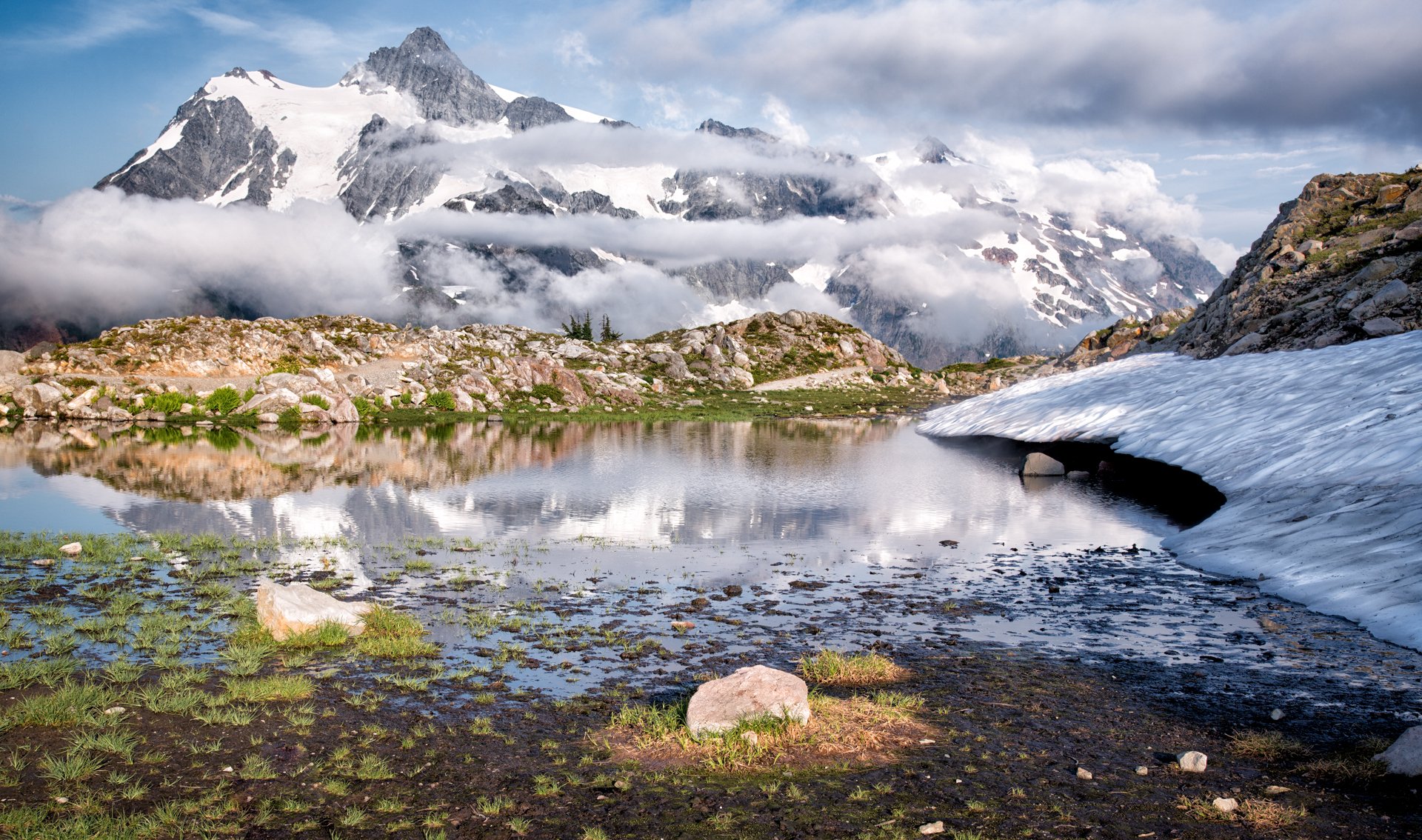 Hermosa vista de la orilla del río en el fondo de las montañas