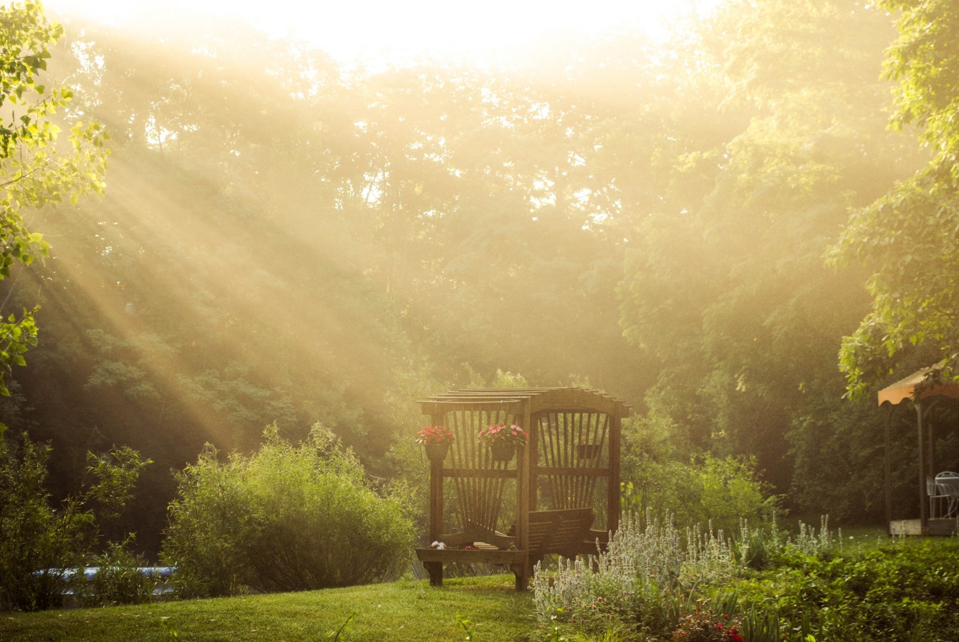 Naturaleza al amanecer. los rayos del sol iluminan el banco del céspedNaturaleza al amanecer. Los rayos del sol iluminan el banco del césped