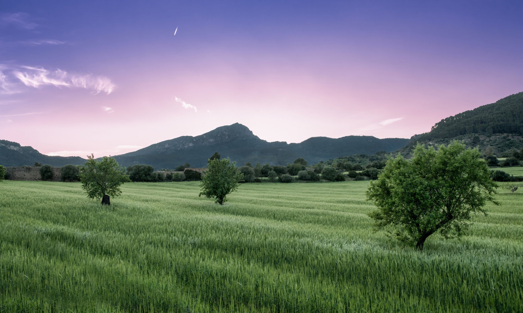 Campo verde en el fondo de la montaña y el cielo lilaCampo verde en el fondo de la montaña y el cielo lila