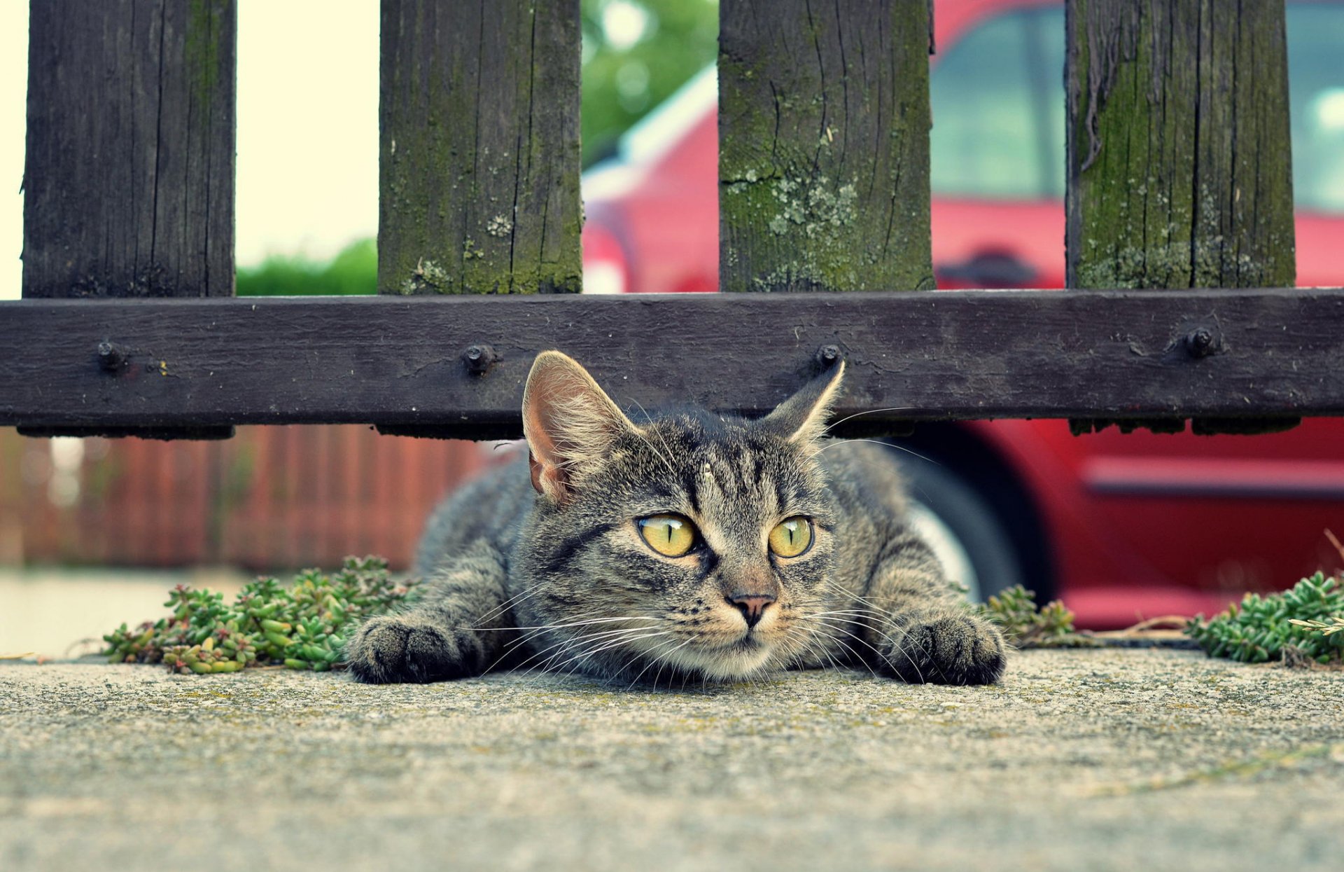 El gato gris yace debajo de la valla