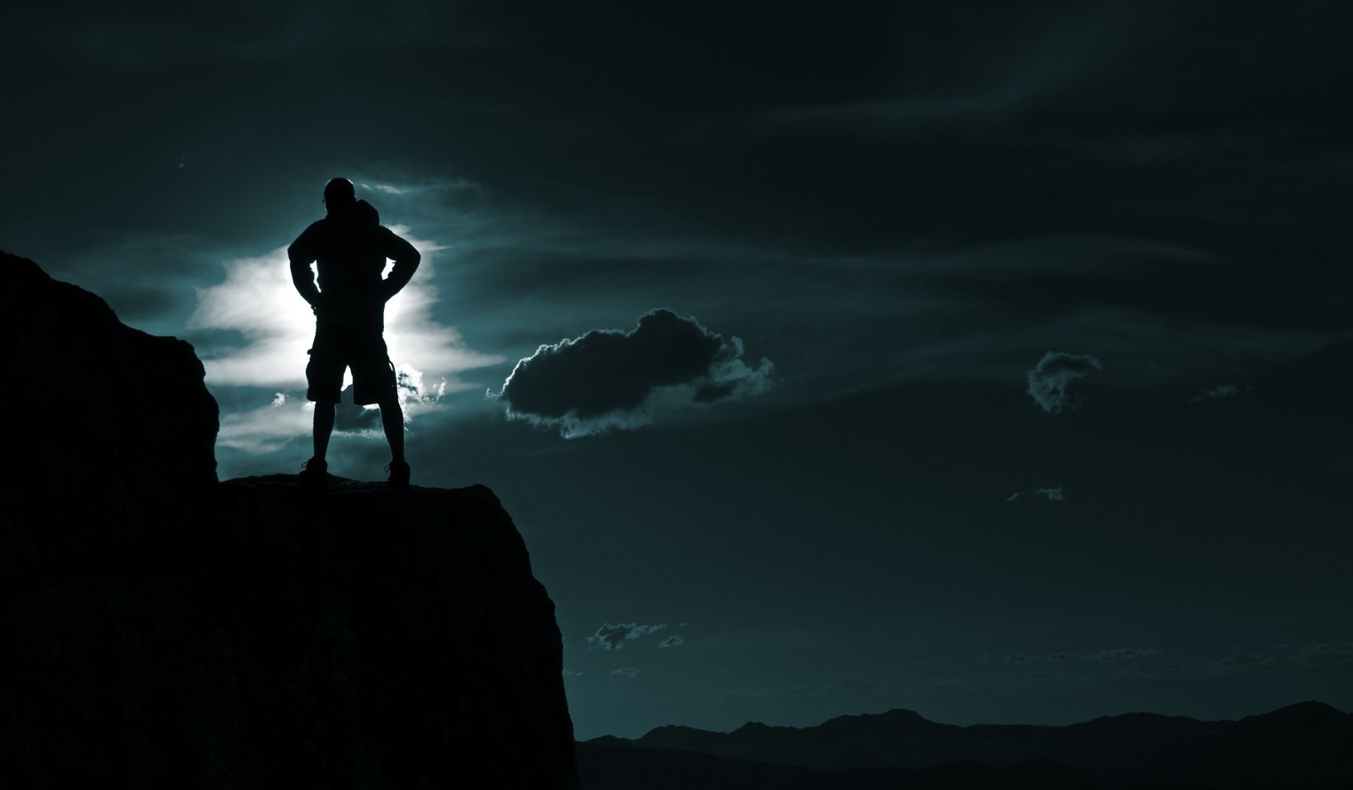 El cielo nocturno y el hombre en la cornisa de la montañaEl cielo nocturno y el hombre en la cornisa de la montaña