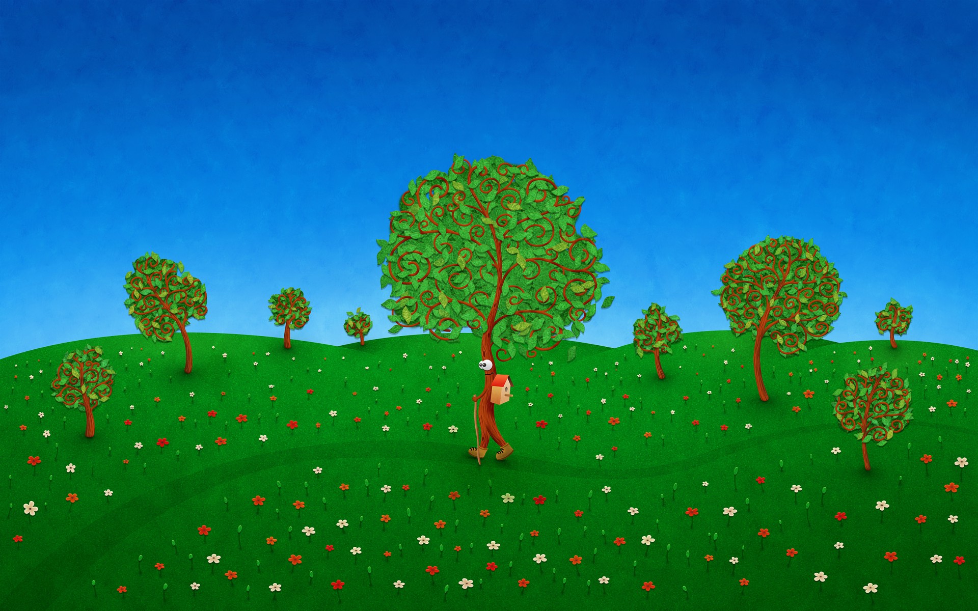 Corazones rojos con hilo rojo en el fondo del árbolCorazones rojos con hilo rojo en el fondo del árbol