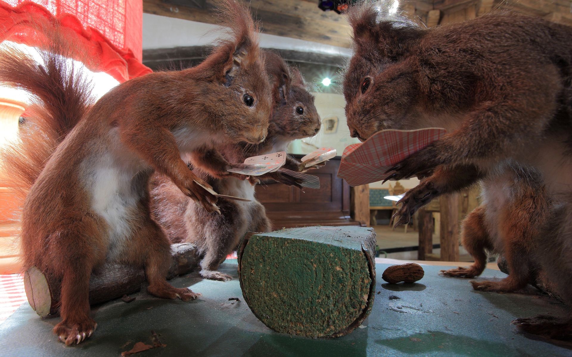 Hermosa muñeca de juguete, sentada en un tronco con un sombrero y un vestido, ojos grandes