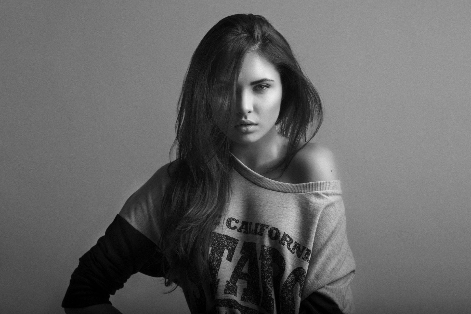 Hermosa chica en una camiseta con el hombro desnudoHermosa chica en una camiseta con el hombro desnudo
