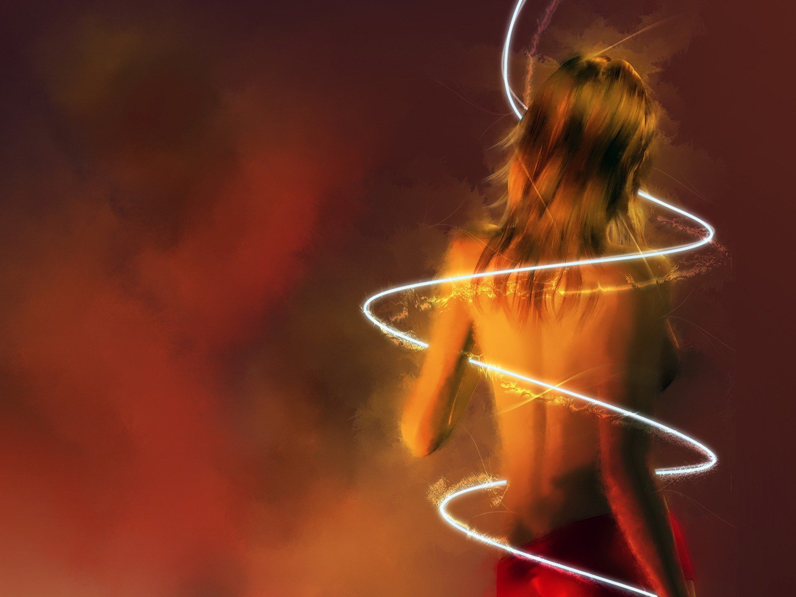 Vista trasera de la chica en el fondo de texturas de color rojo naranjaVista trasera de la chica en el fondo de texturas de color rojo naranja