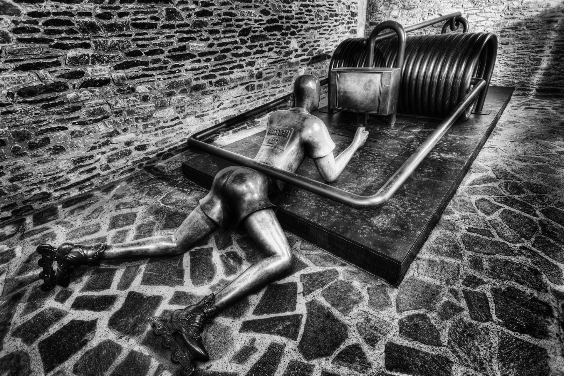 Escultura de un hombre atrapado en una ratonera