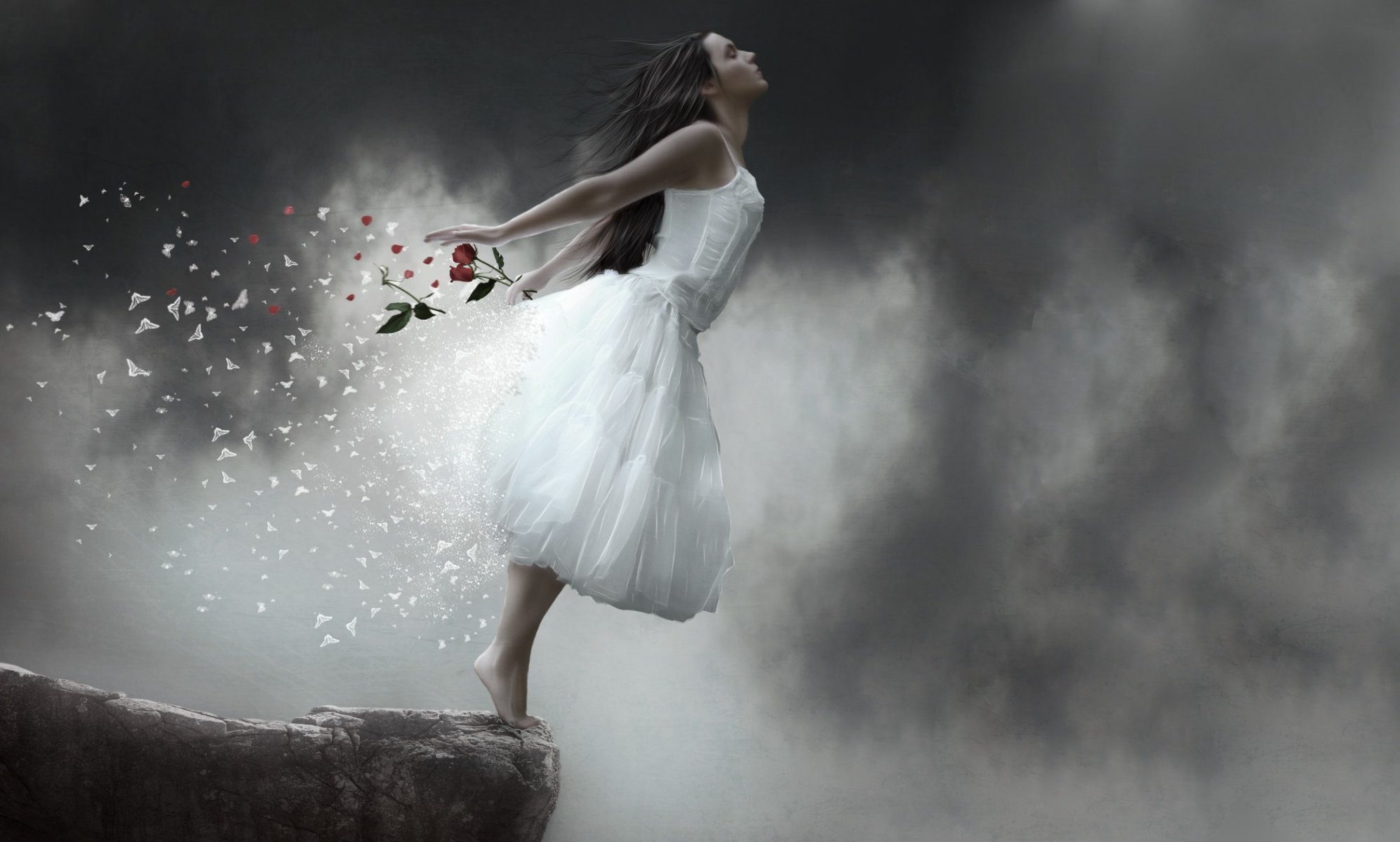 Chica de pie en el borde de un acantilado contra un cielo oscuroChica de pie en el borde de un acantilado contra un cielo oscuro