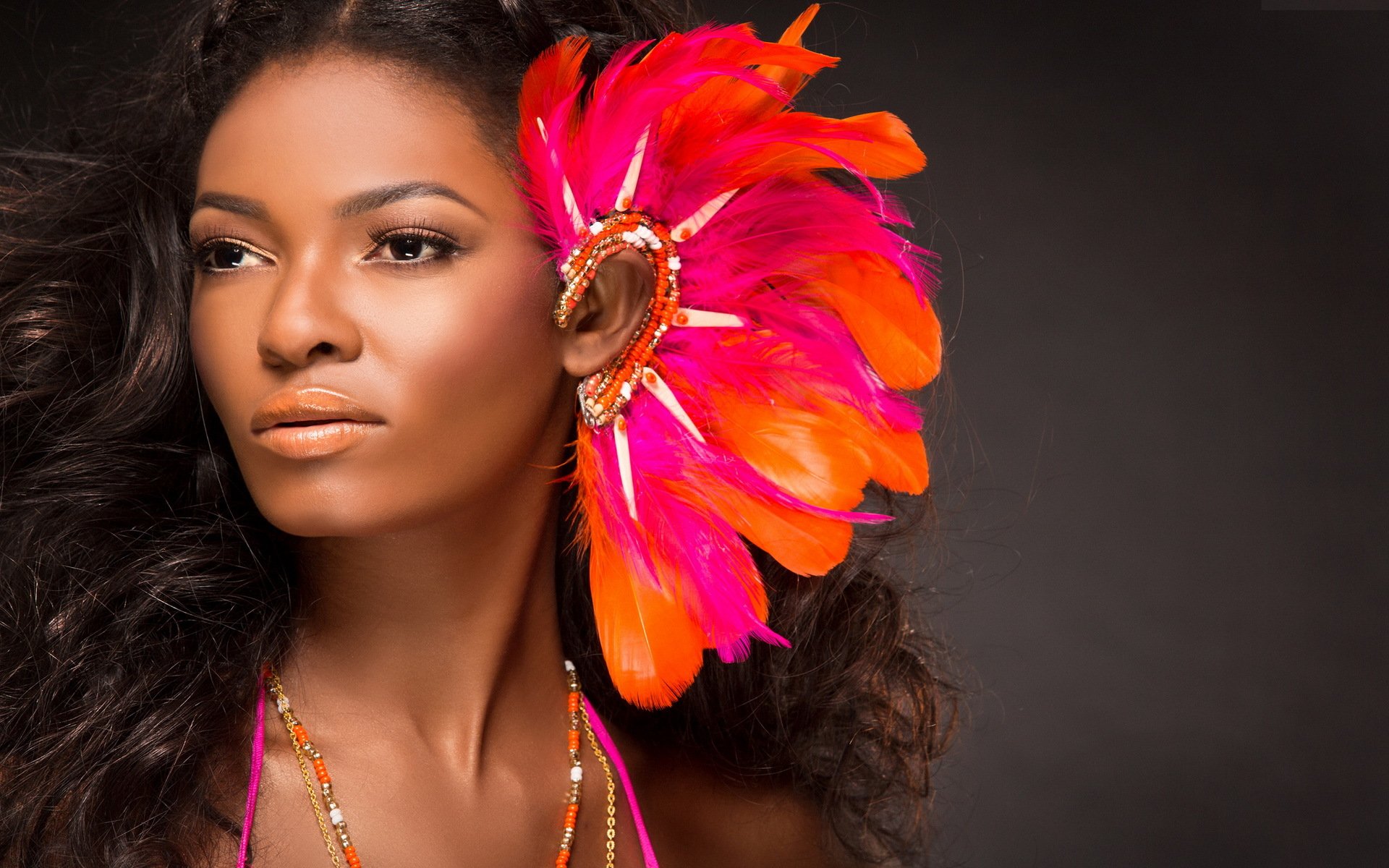 Rizado chica de piel oscura con decoración de plumas en la orejaRizado chica de piel oscura con decoración de plumas en la oreja