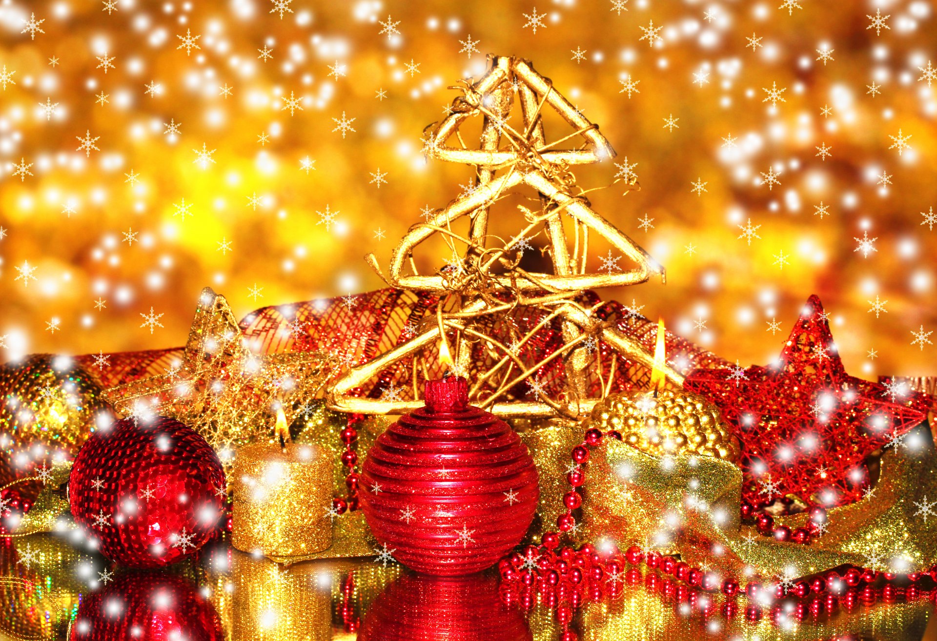 Juguetes de Navidad de oro, conos y panderetas en la nieve