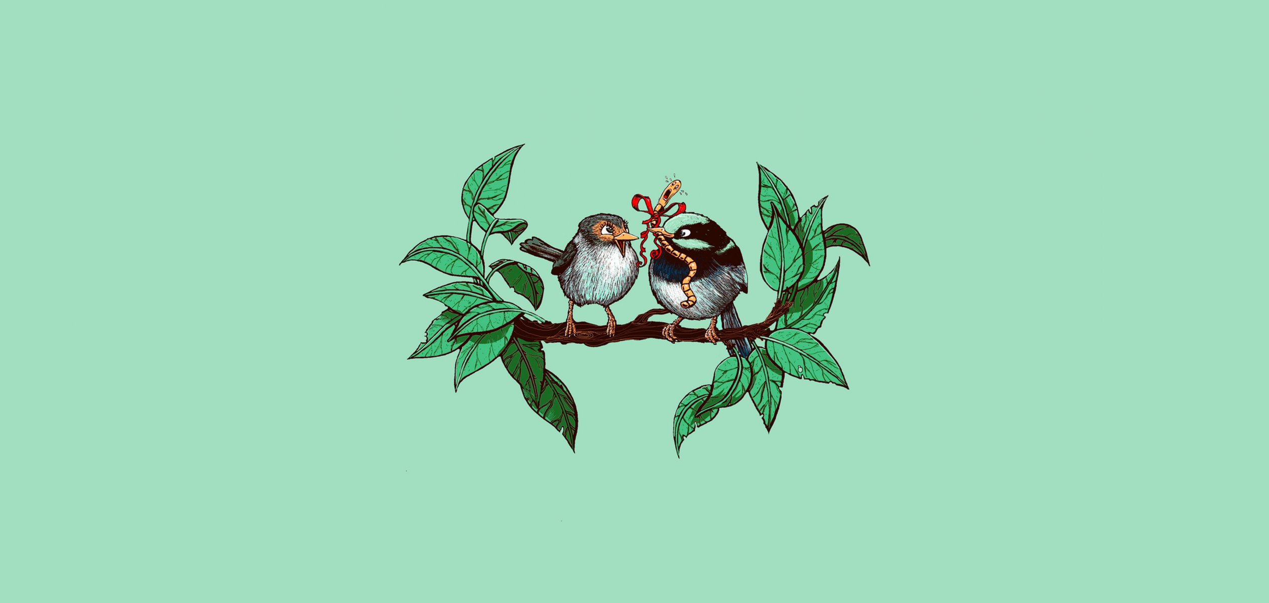 Un par de pájaros se sientan en una rama sobre un fondo verdeUn par de pájaros se sientan en una rama sobre un fondo verde