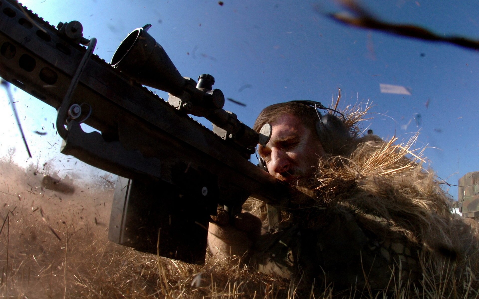 Francotirador disfrazado con rifle, apuntando desde la hierba