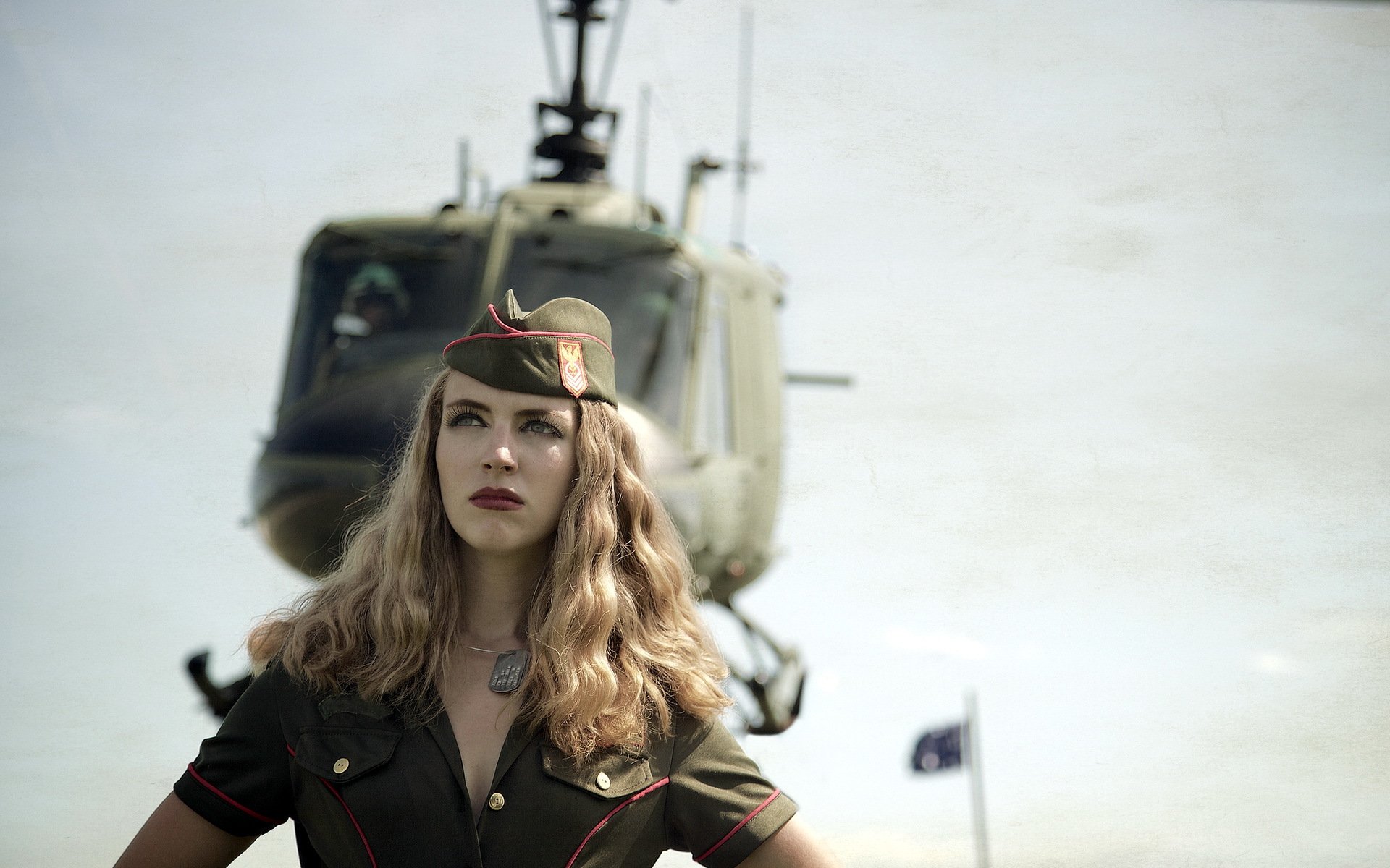 Chica hermosa en forma de piloto frente a un helicópteroChica hermosa en forma de piloto frente a un helicóptero