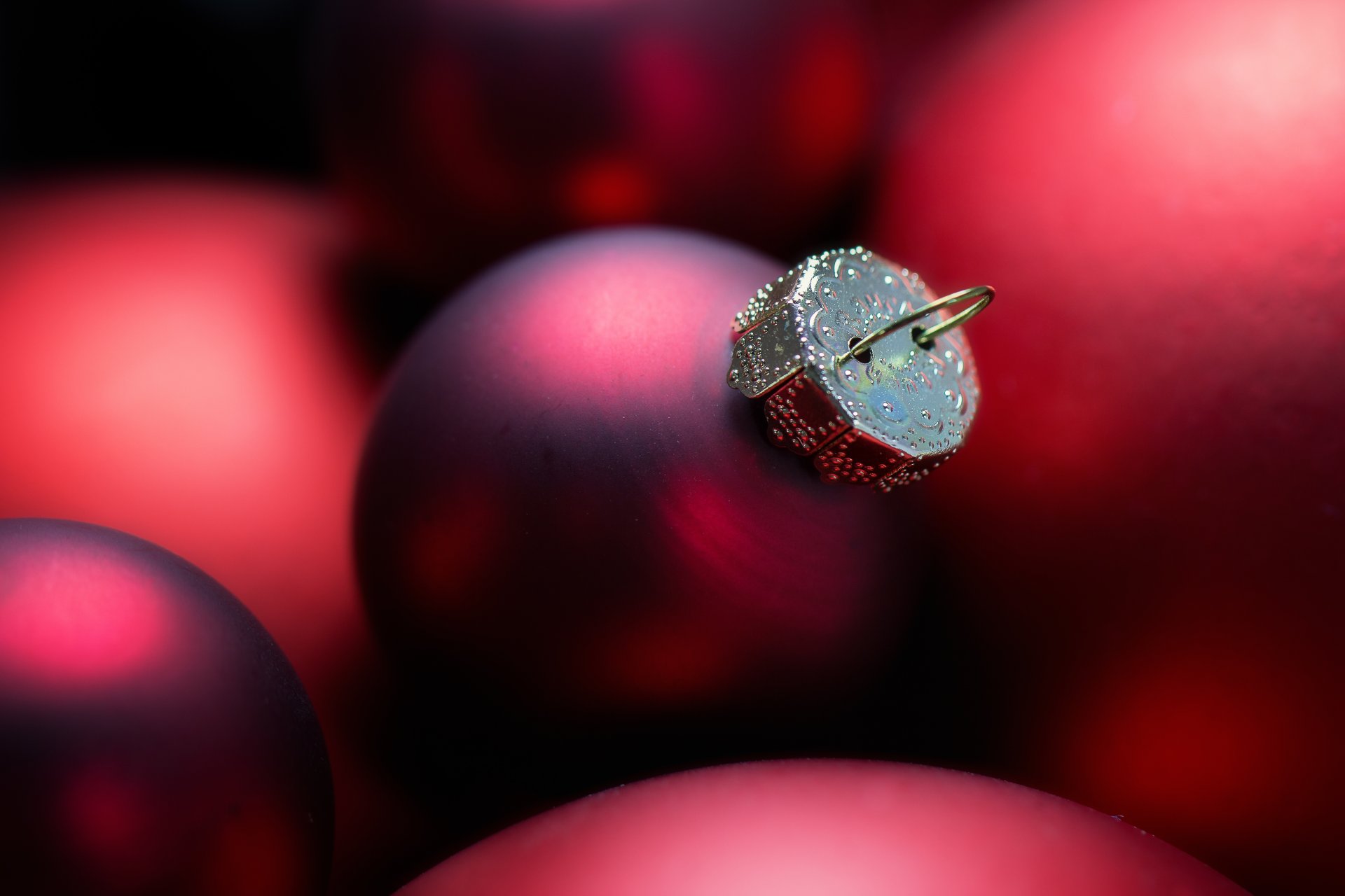 Tres grandes bolas rojas de navidad entre pequeñas plateadasTres grandes bolas rojas de Navidad entre pequeñas plateadas