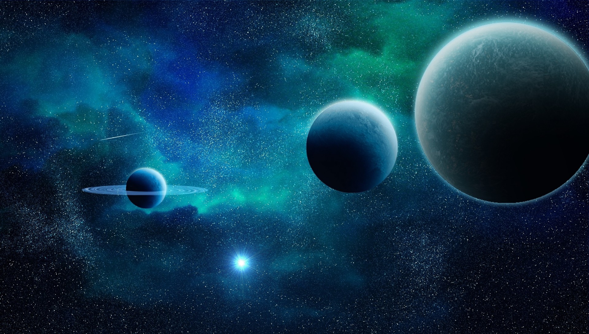 Sobre un fondo negro del espacio, un planeta y una estrella