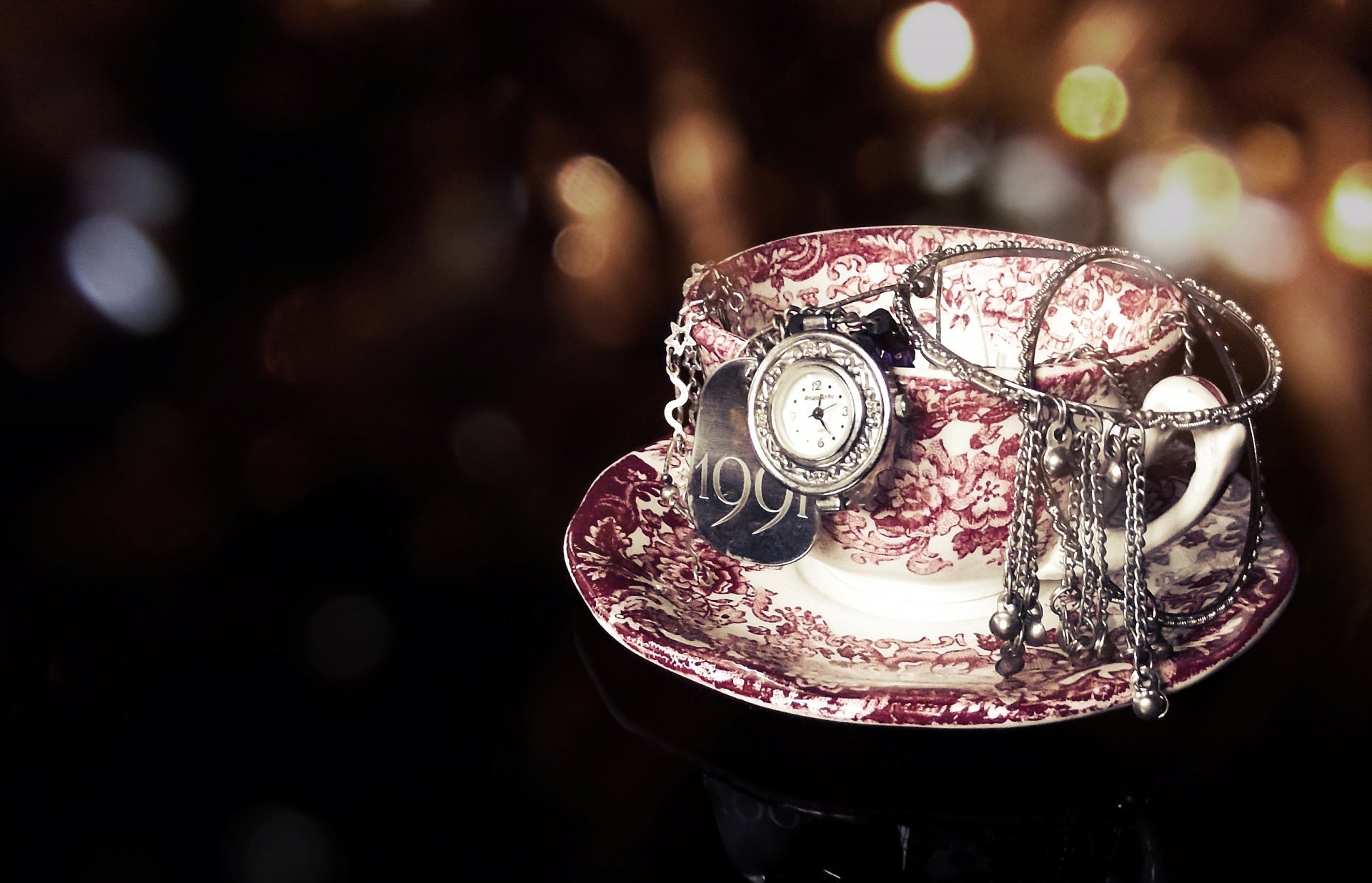 Té en una taza de vidrio con una fila de tulipanes acostadosTé en una taza de vidrio con una fila de tulipanes acostados