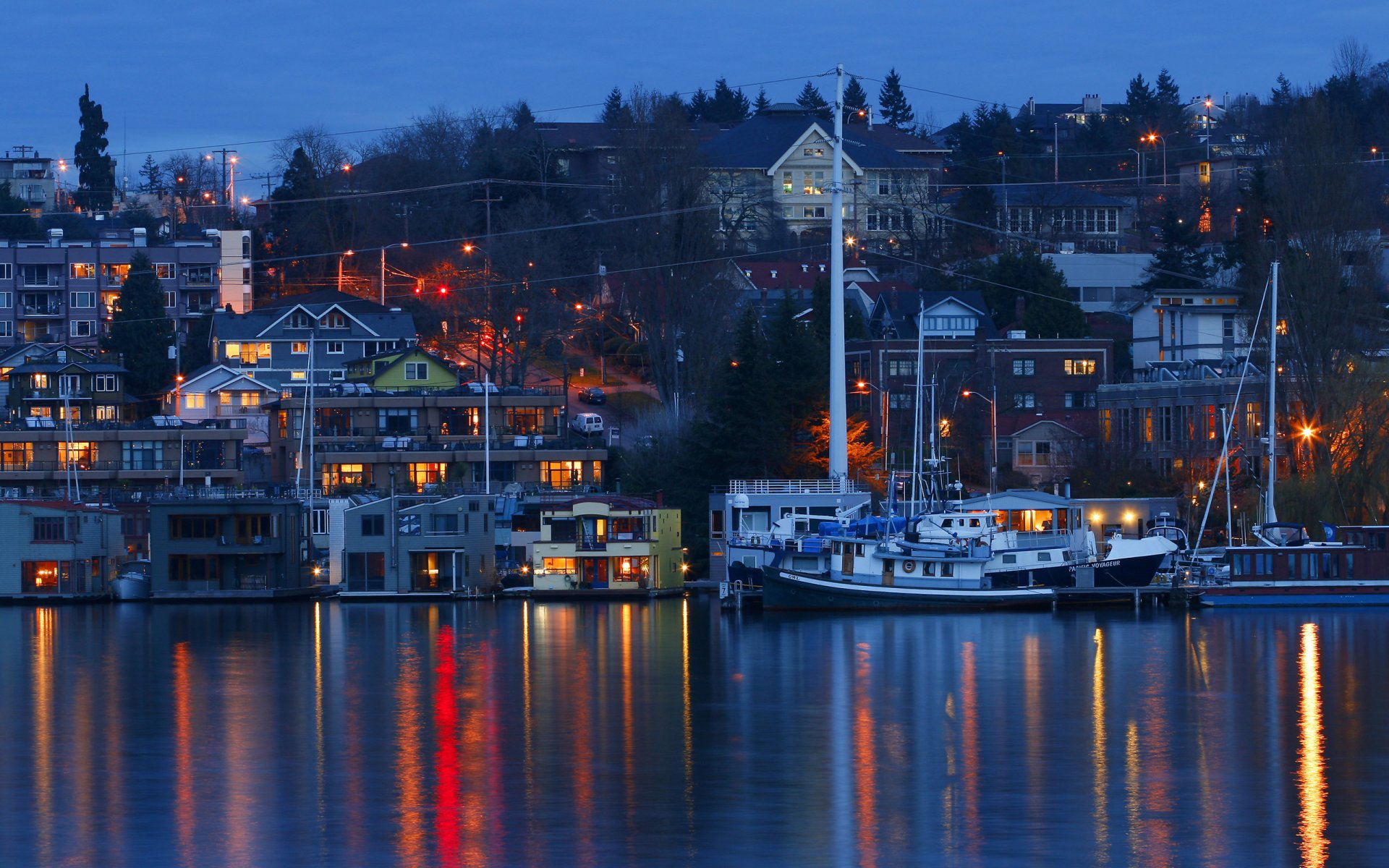 Foto del lago por la noche, en el que se ve la casaFoto del lago por la noche, en el que se ve la casa