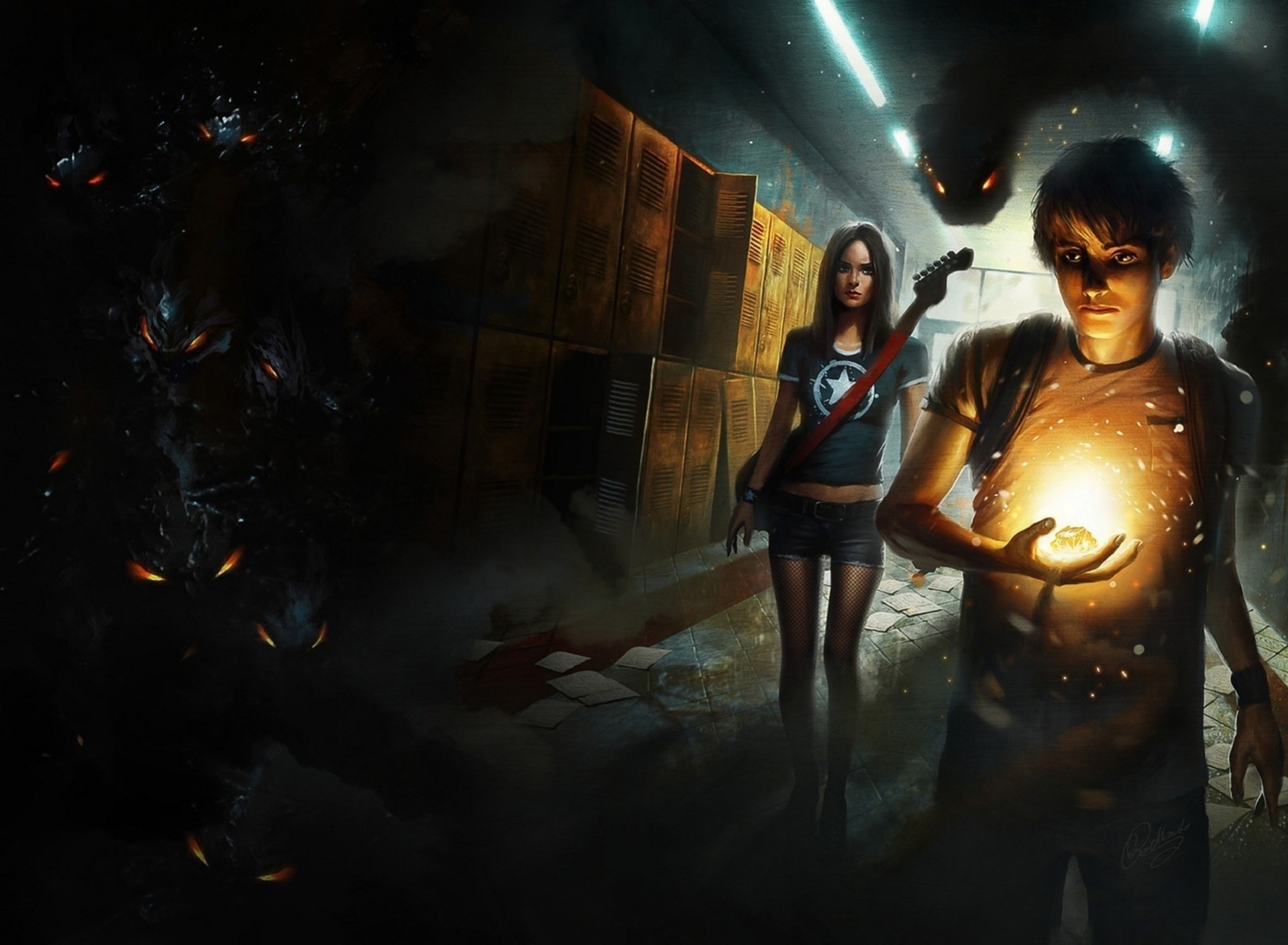 Un chico con una piedra luminosa y una chica con una guitarraUn chico con una piedra luminosa y una chica con una guitarra