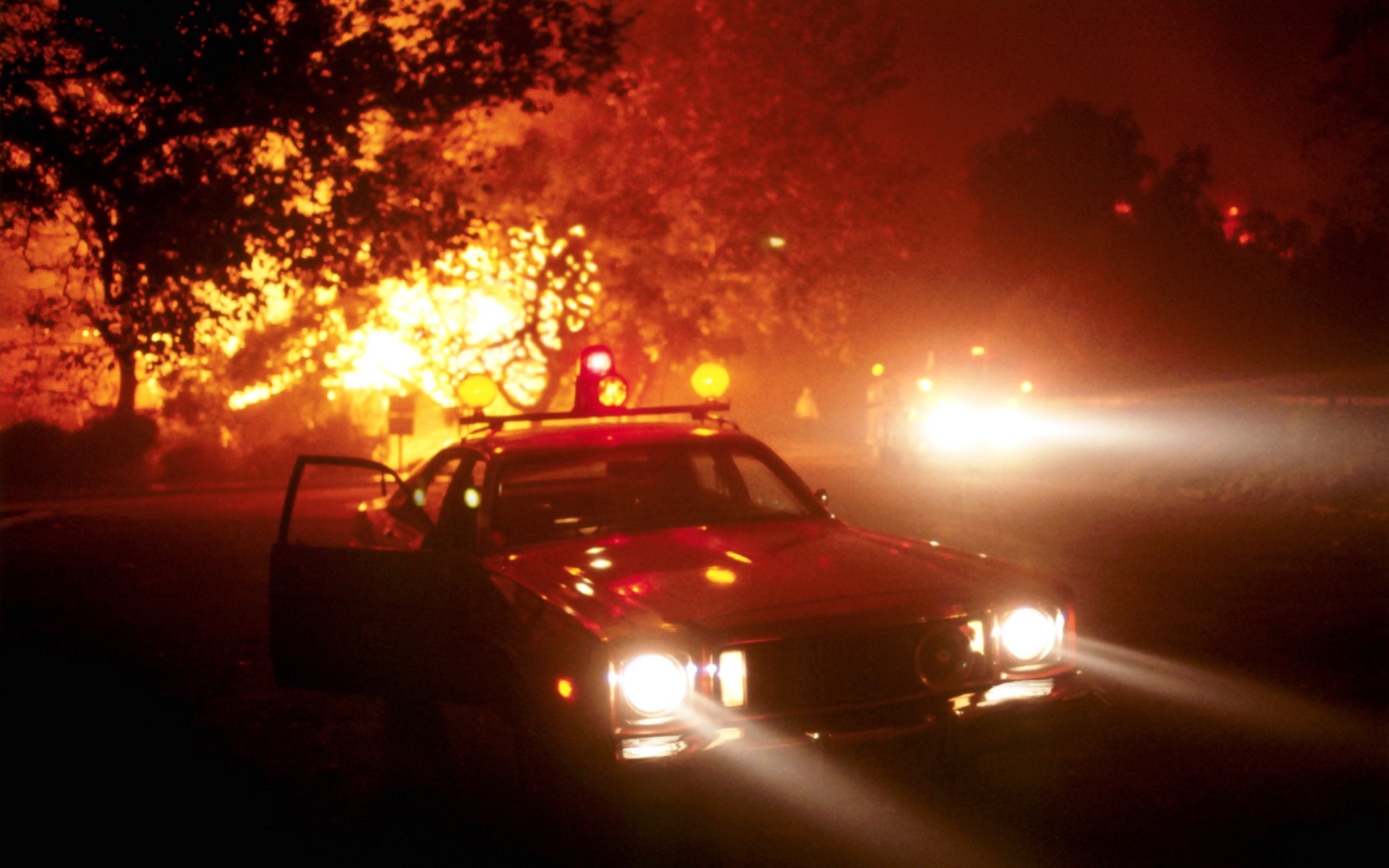 Un coche patrulla se encuentra en medio de una gran llamaUn coche patrulla se encuentra en medio de una gran llama