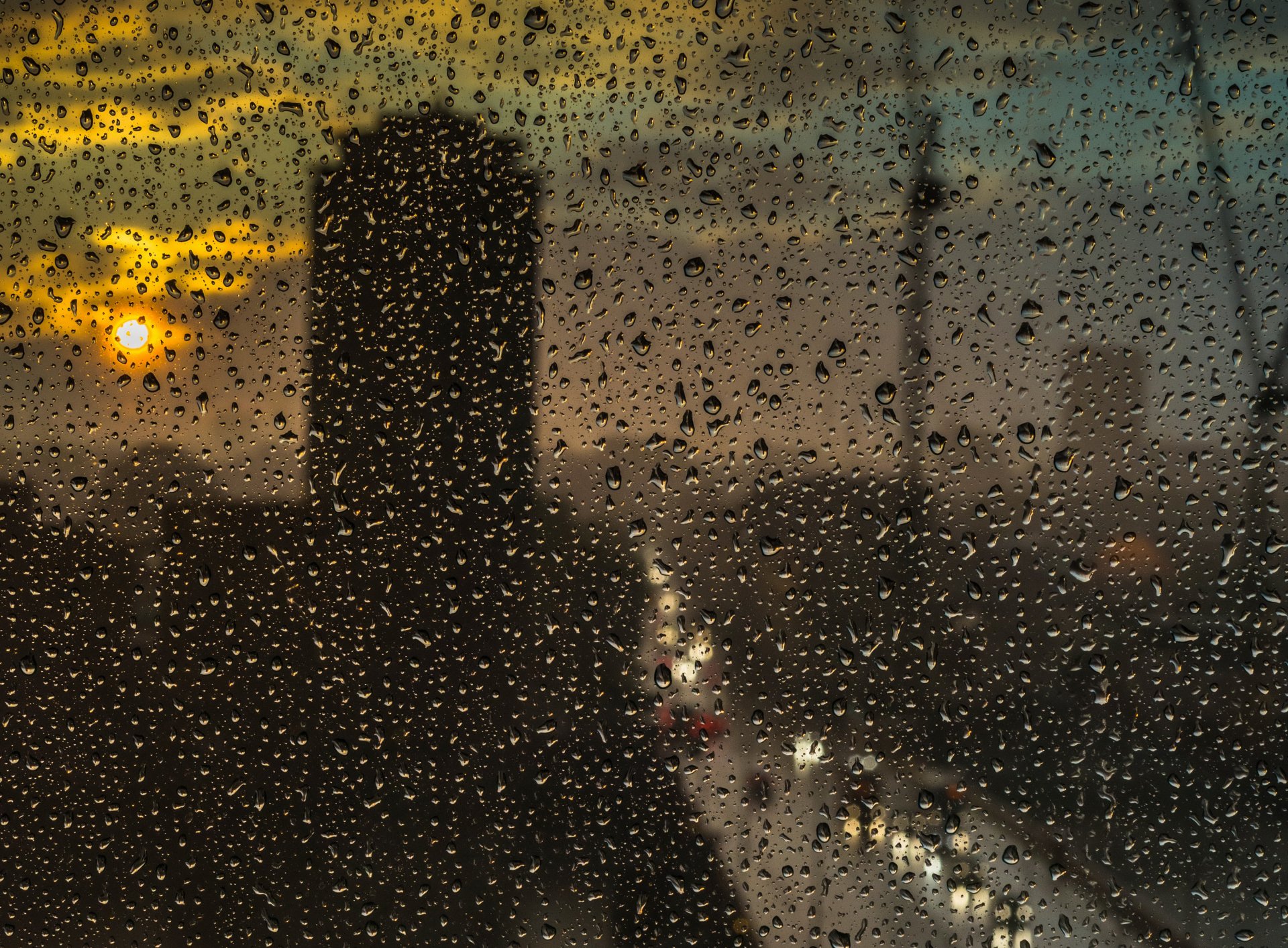 Puesta de sol en un día lluvioso a través del vidrio