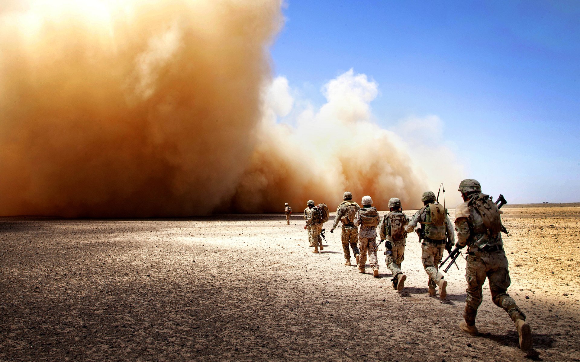 Soldados en el desierto van en una tormenta de polvoSoldados en el desierto van en una tormenta de polvo