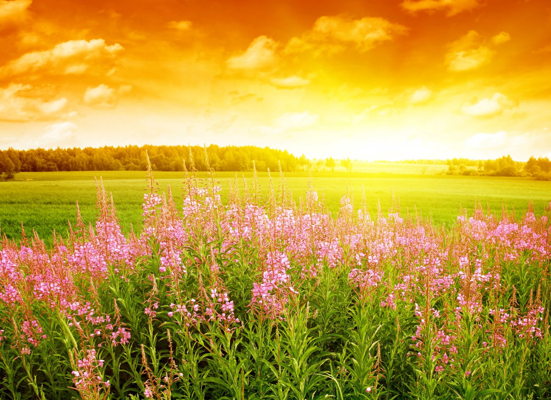Flores silvestres en el fondo de una hermosa puesta de solFlores silvestres en el fondo de una hermosa puesta de sol