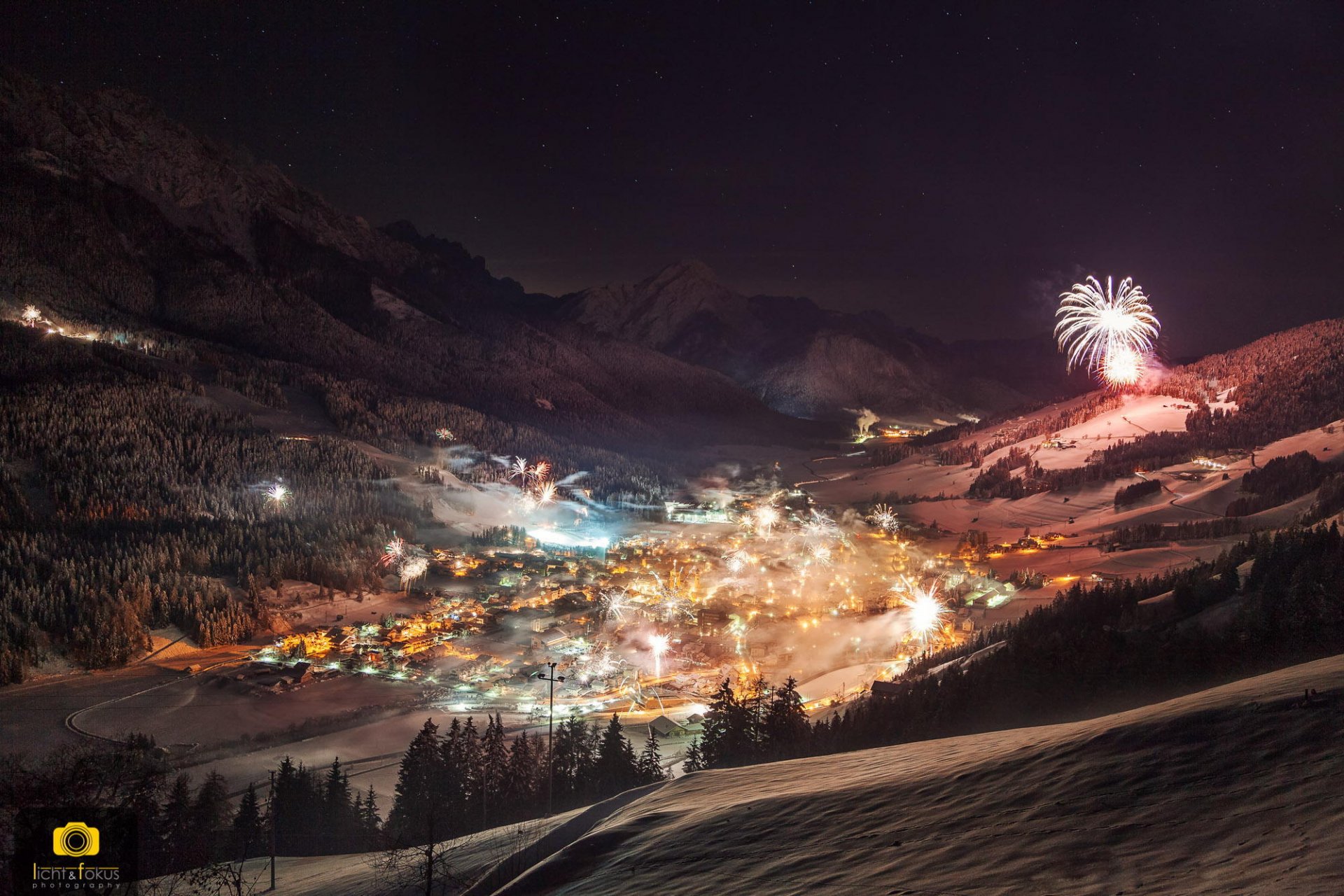 Ciudad nocturna de invierno con luces y fuegos artificialesCiudad nocturna de invierno con luces y fuegos artificiales