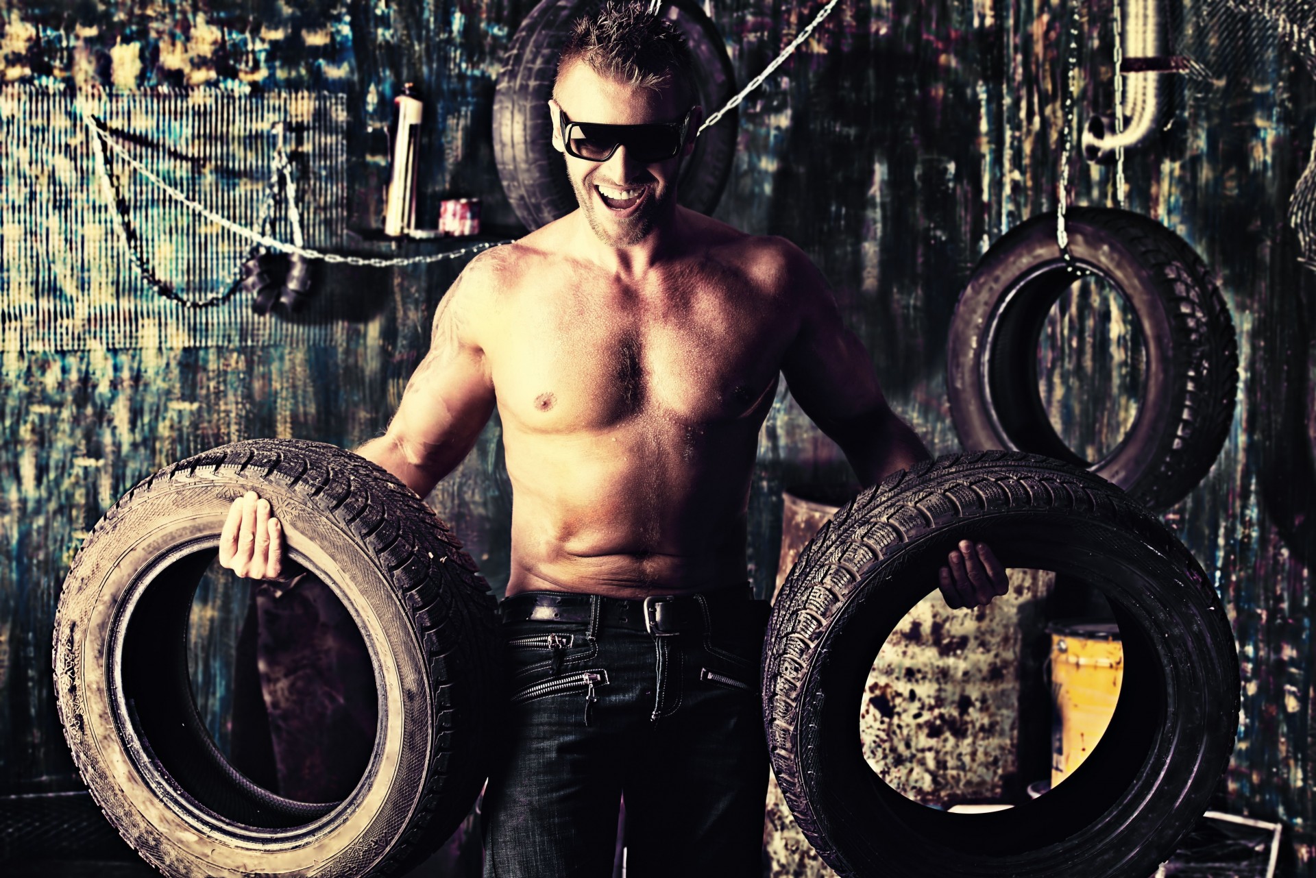 Hombre con gafas negras y torso desnudo sostiene neumáticos en sus manosHombre con gafas negras y torso desnudo sostiene neumáticos en sus manos