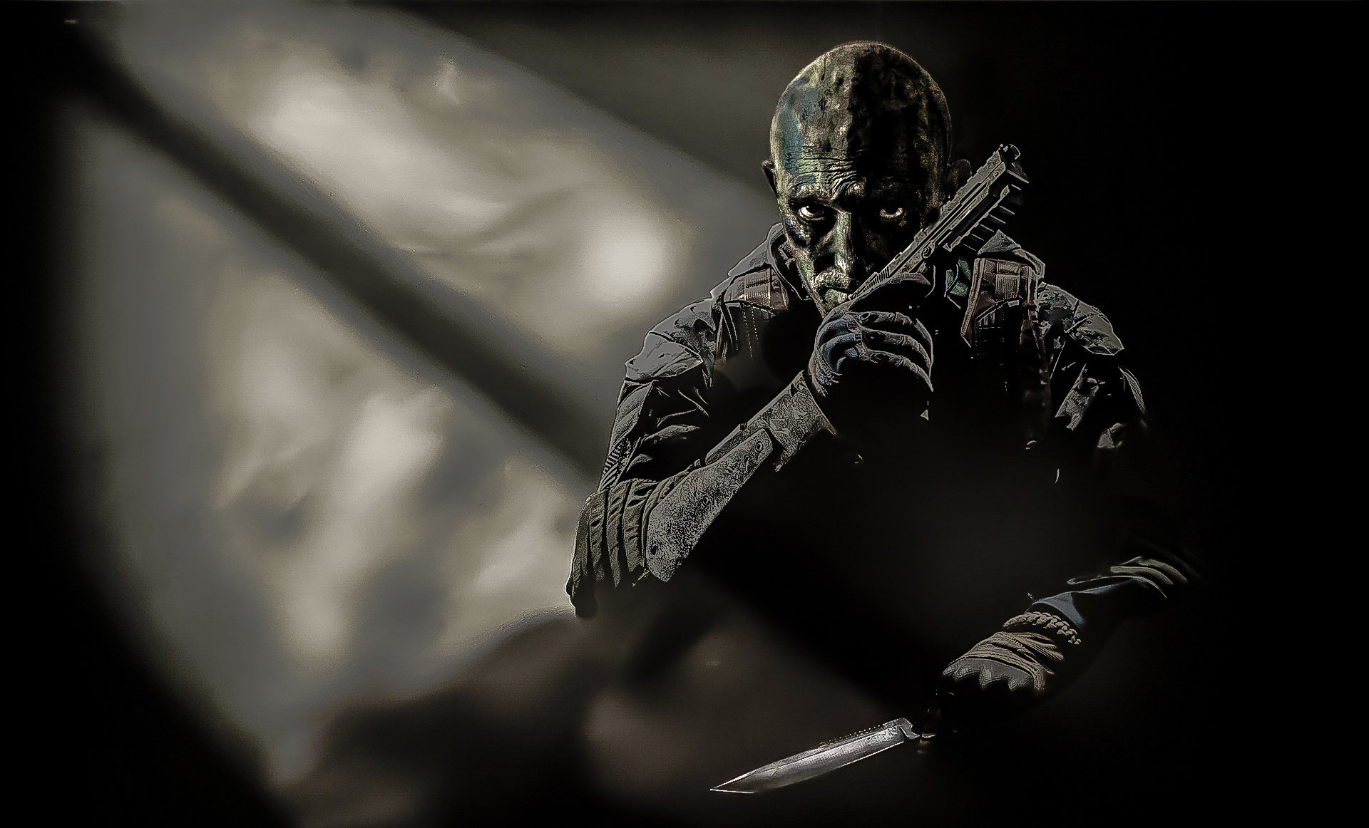 Un hombre camina por un campo de miedo con un espantapájarosUn hombre camina por un campo de miedo con un espantapájaros
