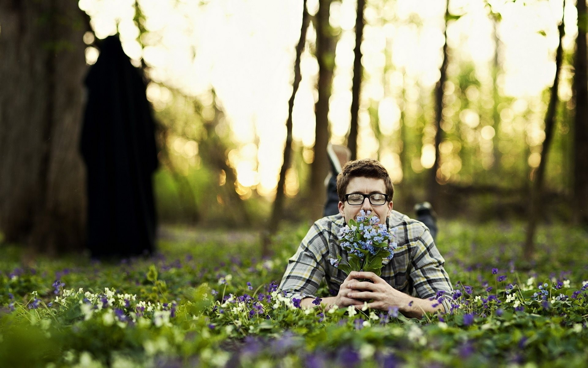 Un hombre yace en un claro en el bosque con un ramo de flores