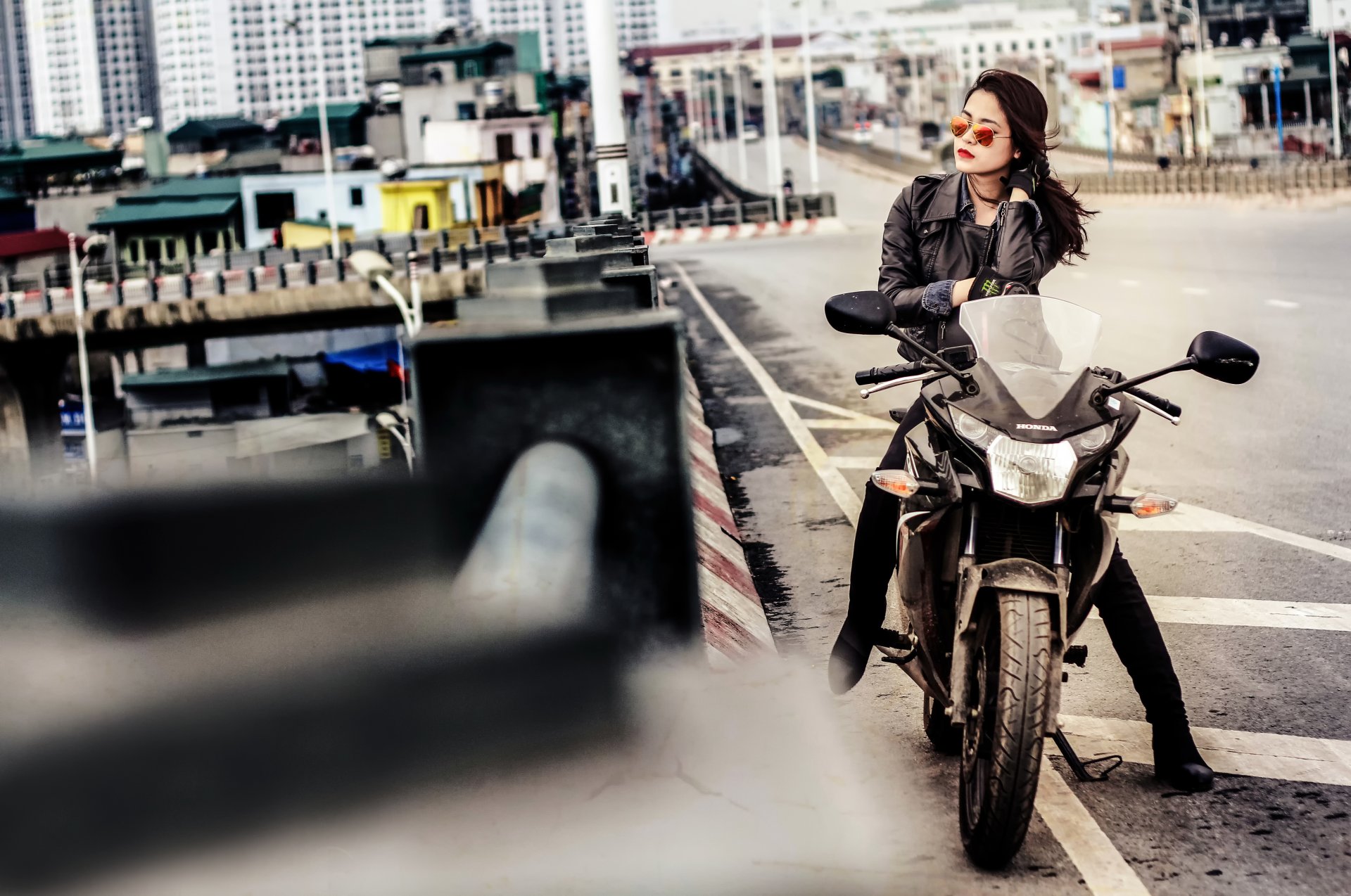 Honda blanco afinado, vista frontal y lateral, en carretera asfaltadaHonda blanco afinado, vista frontal y lateral, en carretera asfaltada