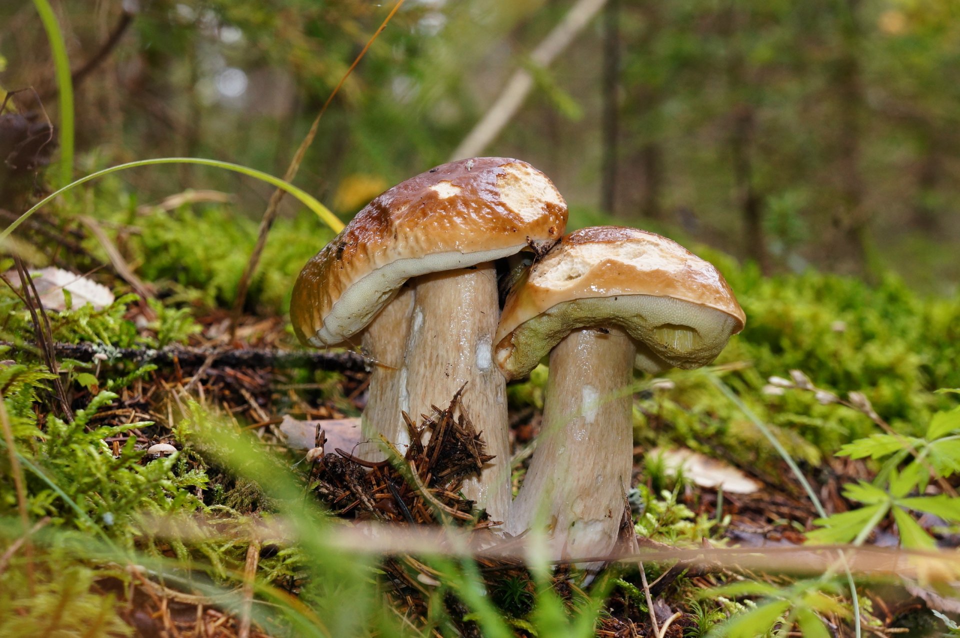 Familia de hongos porcini que crecen entre musgo esponjoso