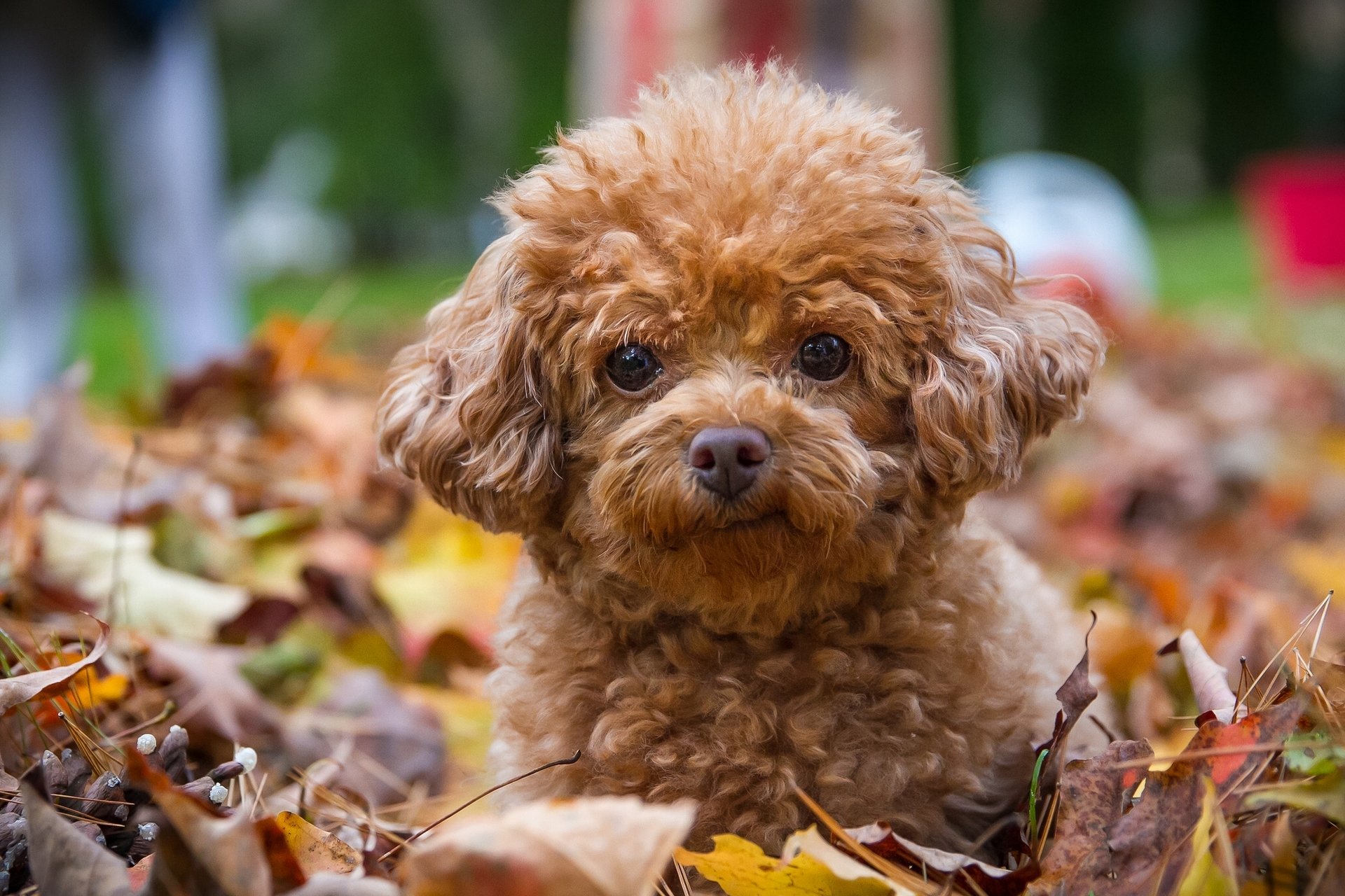 Cachorro pelirrojo en el follaje de otoño