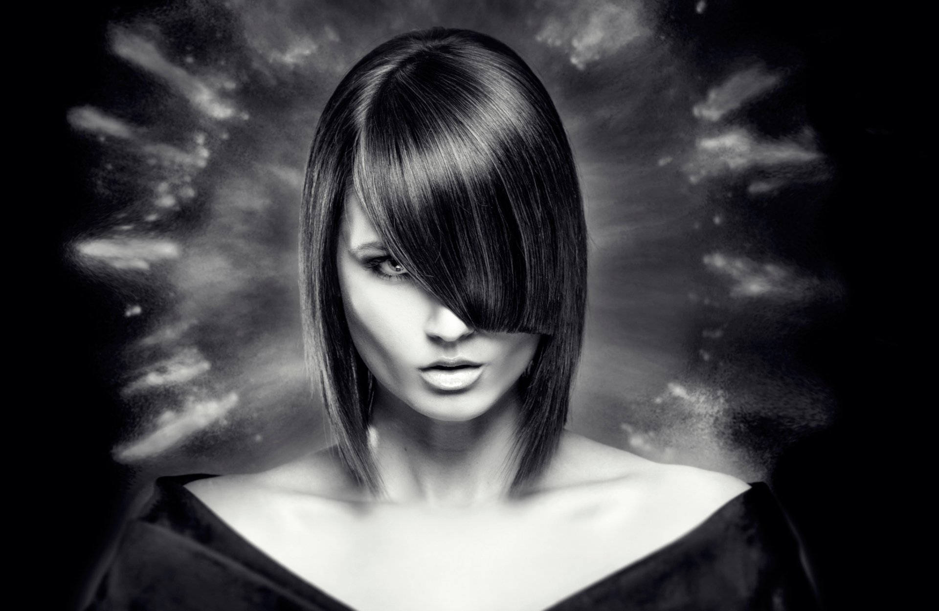 Imagen en blanco y negro de una chica con un cuadrado y un flequillo muy largoImagen en blanco y negro de una chica con un cuadrado y un flequillo muy largo