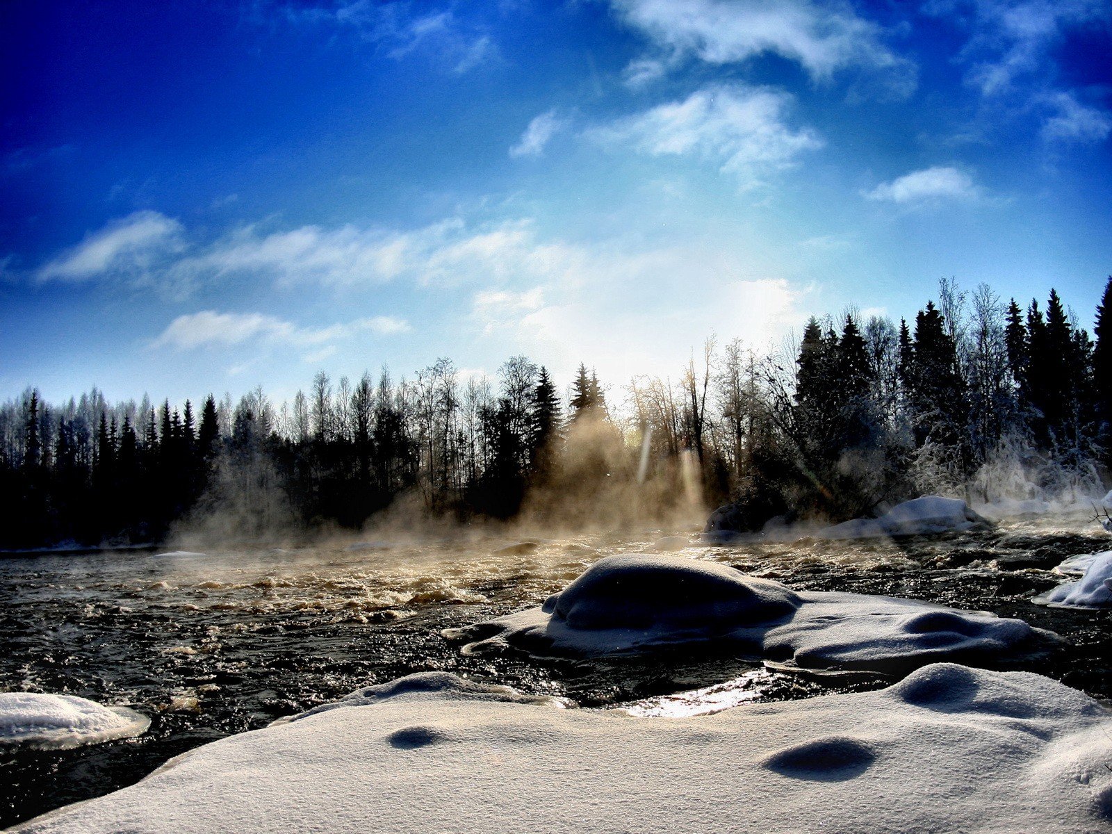 Bajo las ramas de los abetos cubiertos de nieve, el flujo de invierno burbujeaBajo las ramas de los abetos cubiertos de nieve, el flujo de invierno burbujea