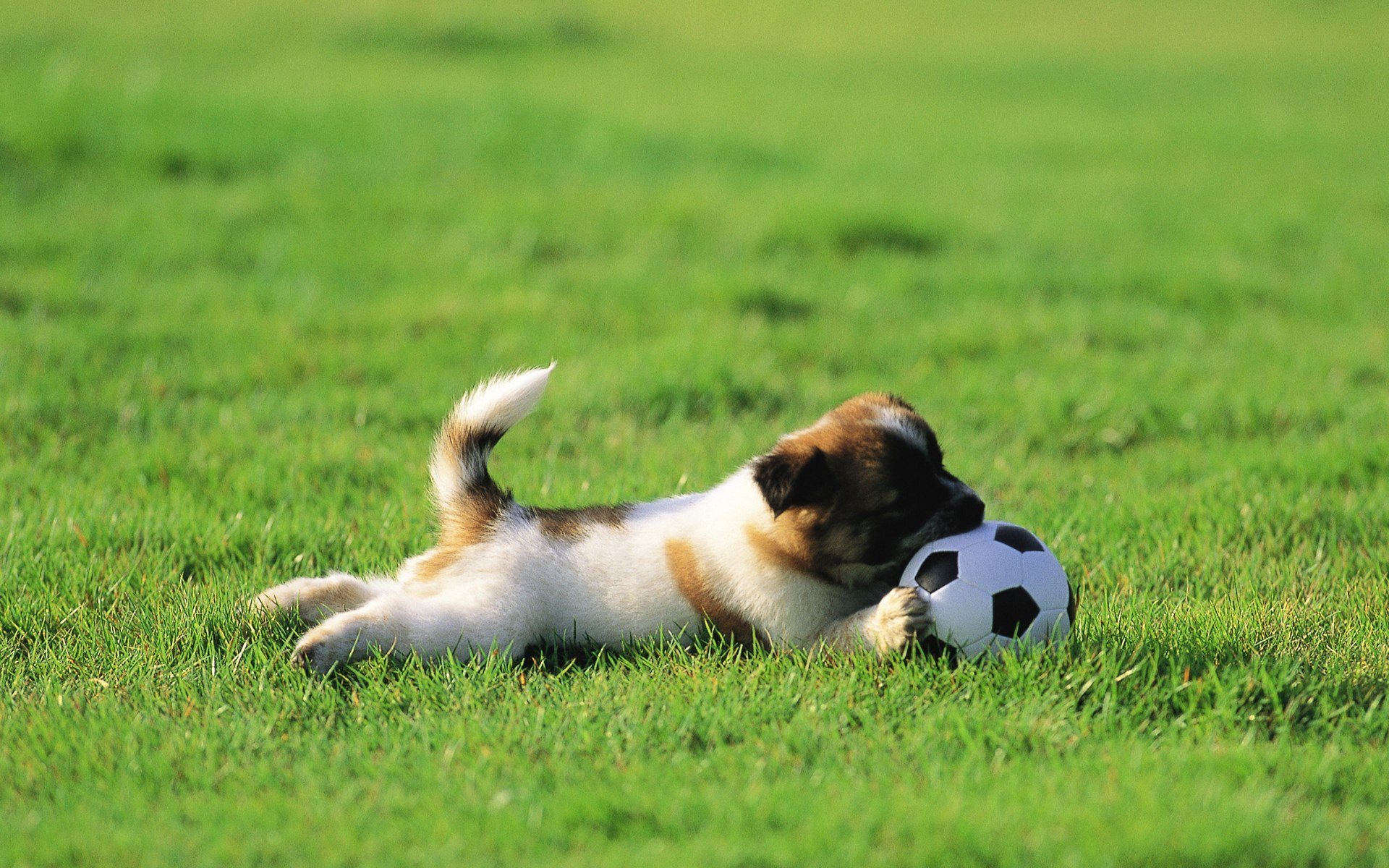 Pequeño cachorro acostado en el césped con una pelota de fútbolPequeño cachorro acostado en el césped con una pelota de fútbol