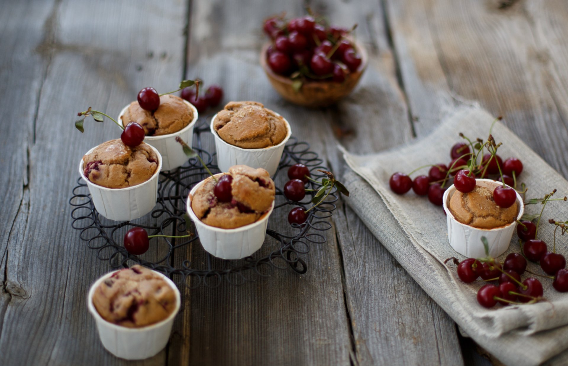 Cupcake con decoraciones en forma de flores sobre un fondo azulCupcake con decoraciones en forma de flores sobre un fondo azul