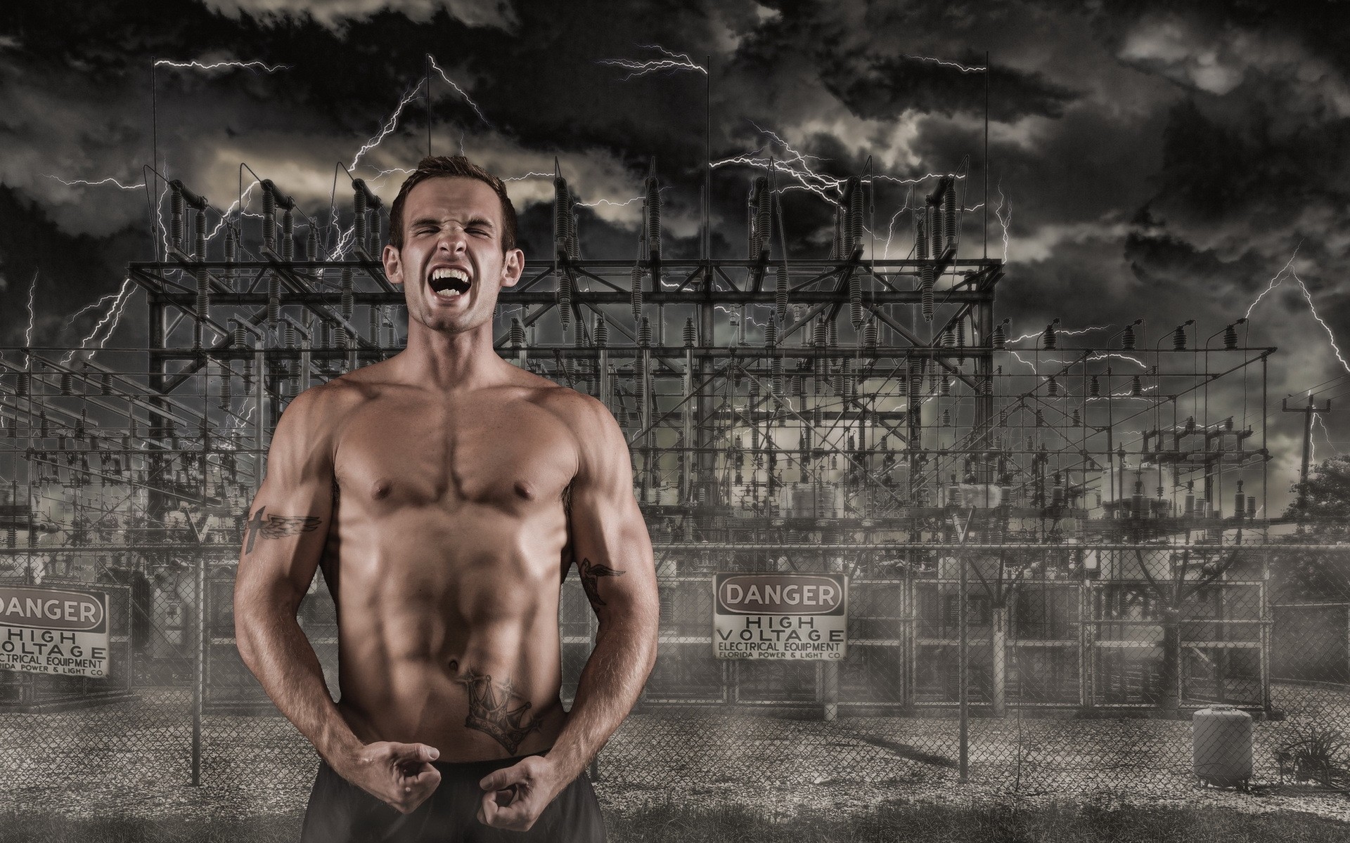 Hombre con el torso desnudo sostiene una cadena en sus manos