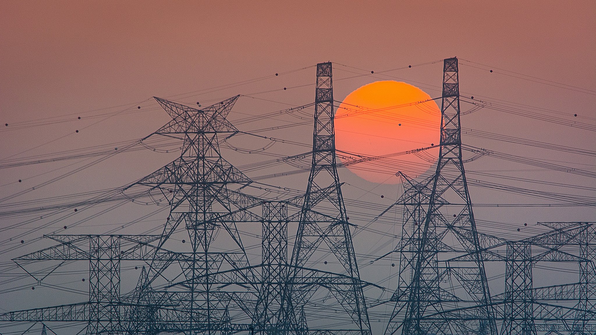 Líneas de transmisión en el fondo de una puesta de sol roja brillante