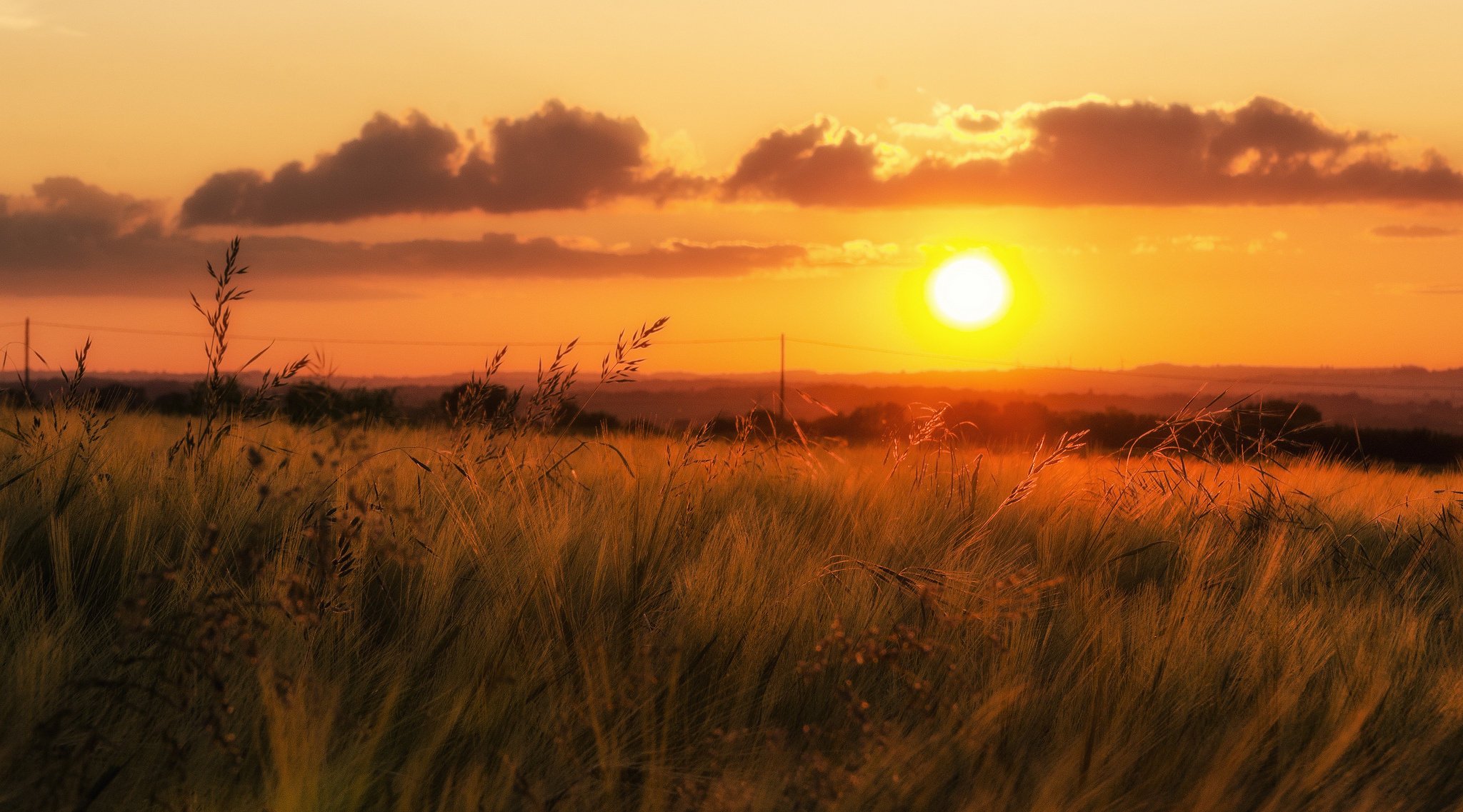 Cielo naranja durante la puesta del sol, valle con hierbaCielo naranja durante la puesta del sol, valle con hierba