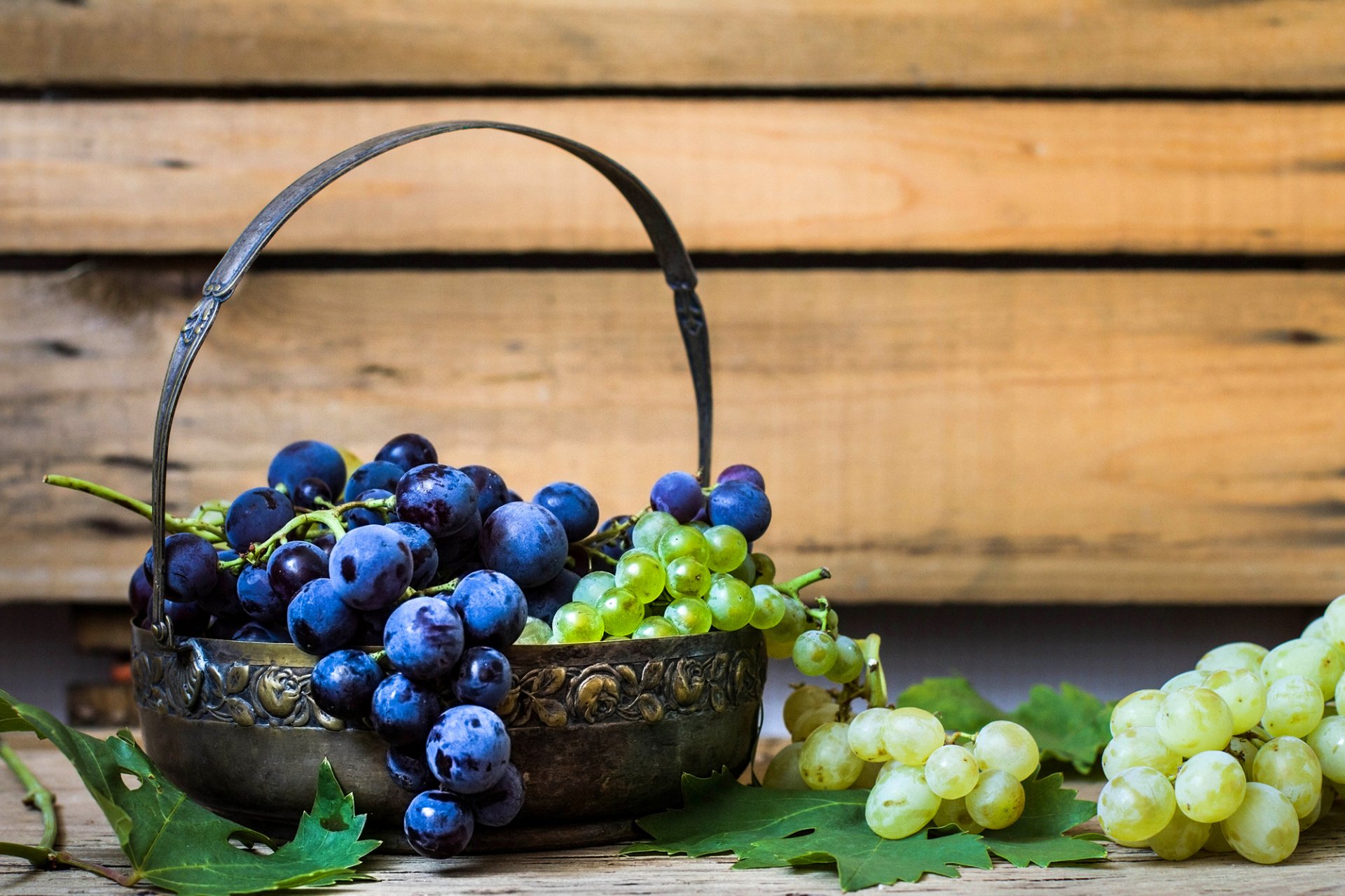Racimos de uvas blancas y rojas en la mesa y en la cestaRacimos de uvas blancas y rojas en la mesa y en la cesta