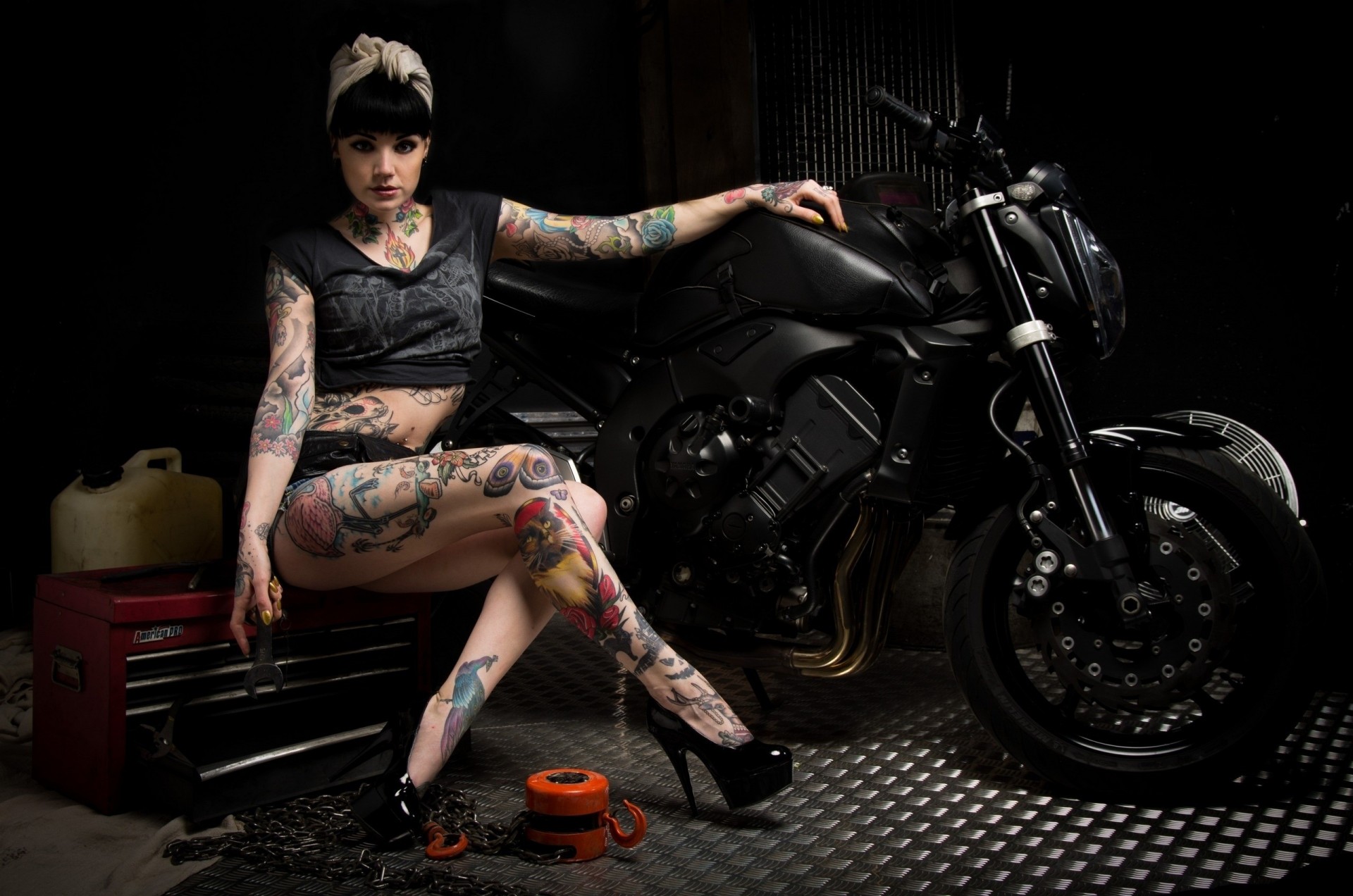 Chica con tatuajes sentada al lado de una motocicleta negraChica con tatuajes sentada al lado de una motocicleta negra