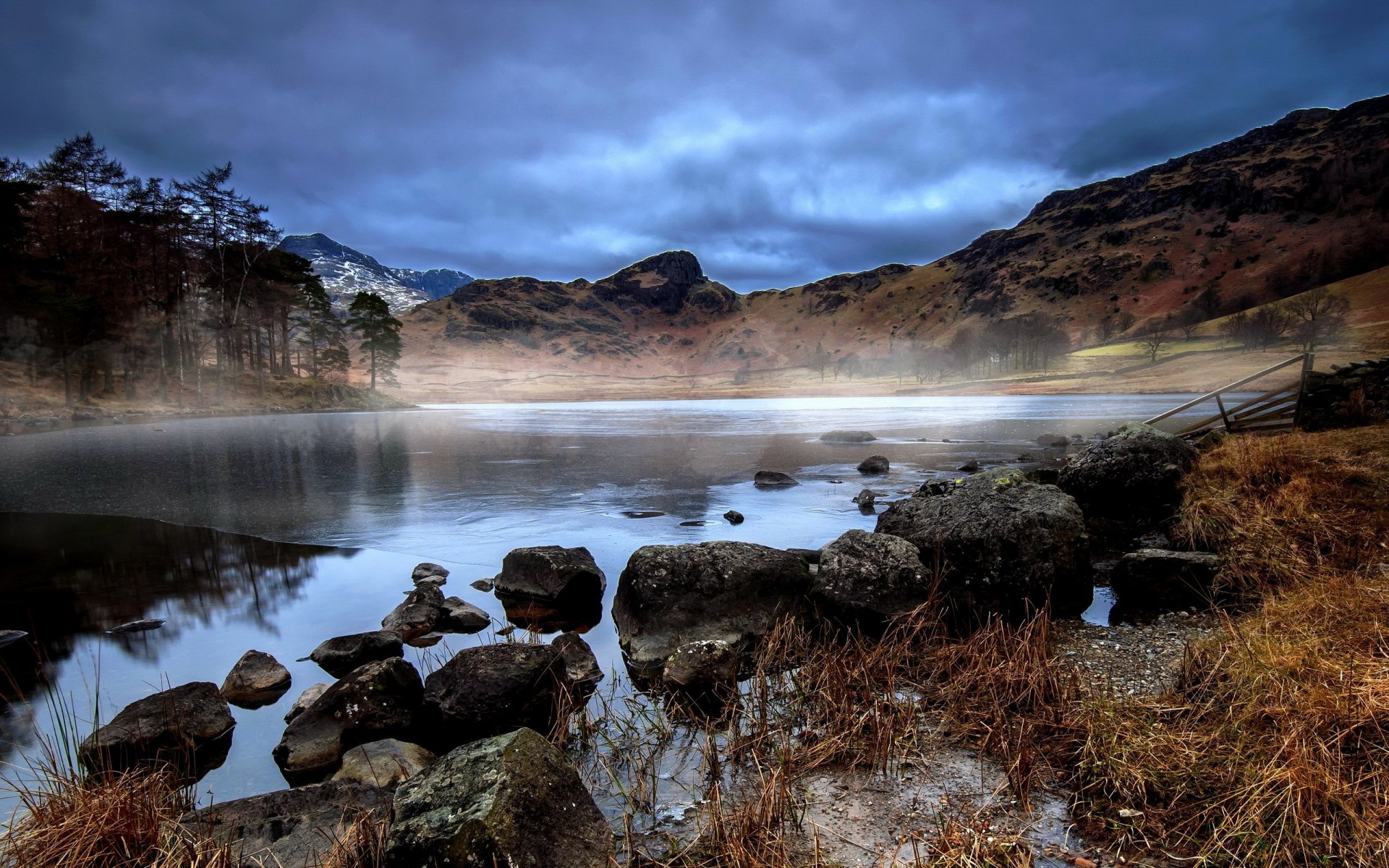 La superficie del lago de montaña refleja místicamente el cieloLa superficie del lago de montaña refleja místicamente el cielo