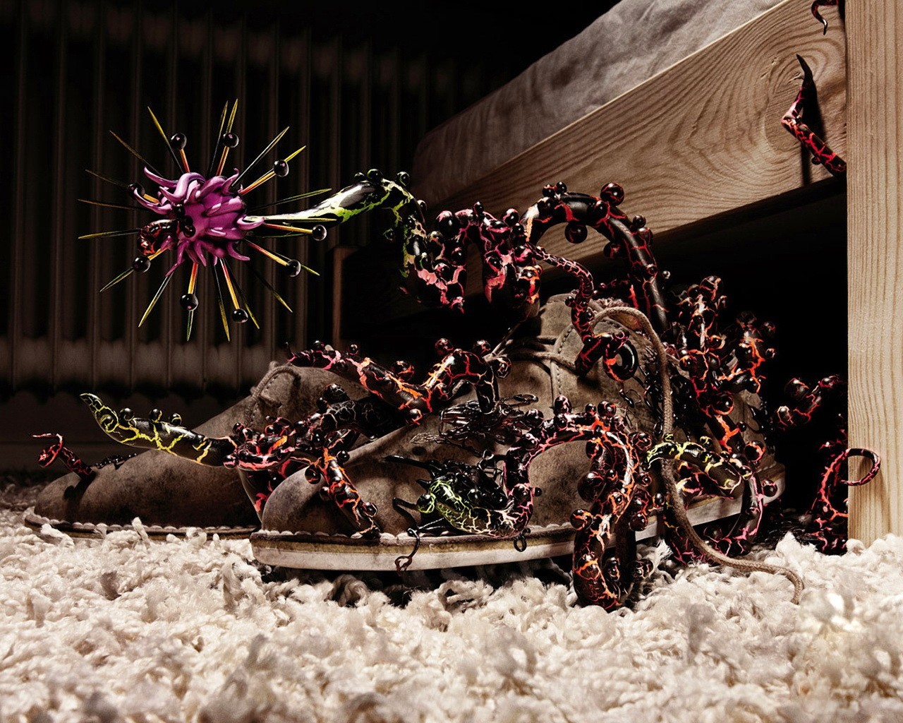 Un niño pequeño se sienta en el suelo en un pañal al lado de un par de zapatos pequeñosUn niño pequeño se sienta en el Suelo en un pañal al lado de un par de zapatos pequeños