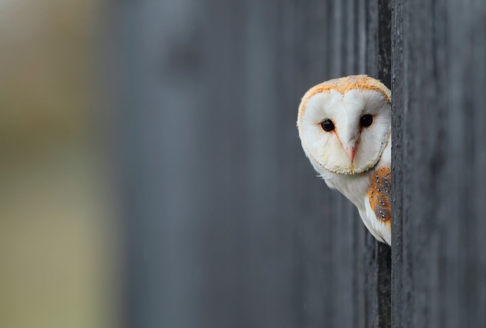 Un búho blanco sobre un fondo gris se asoma por la rendija