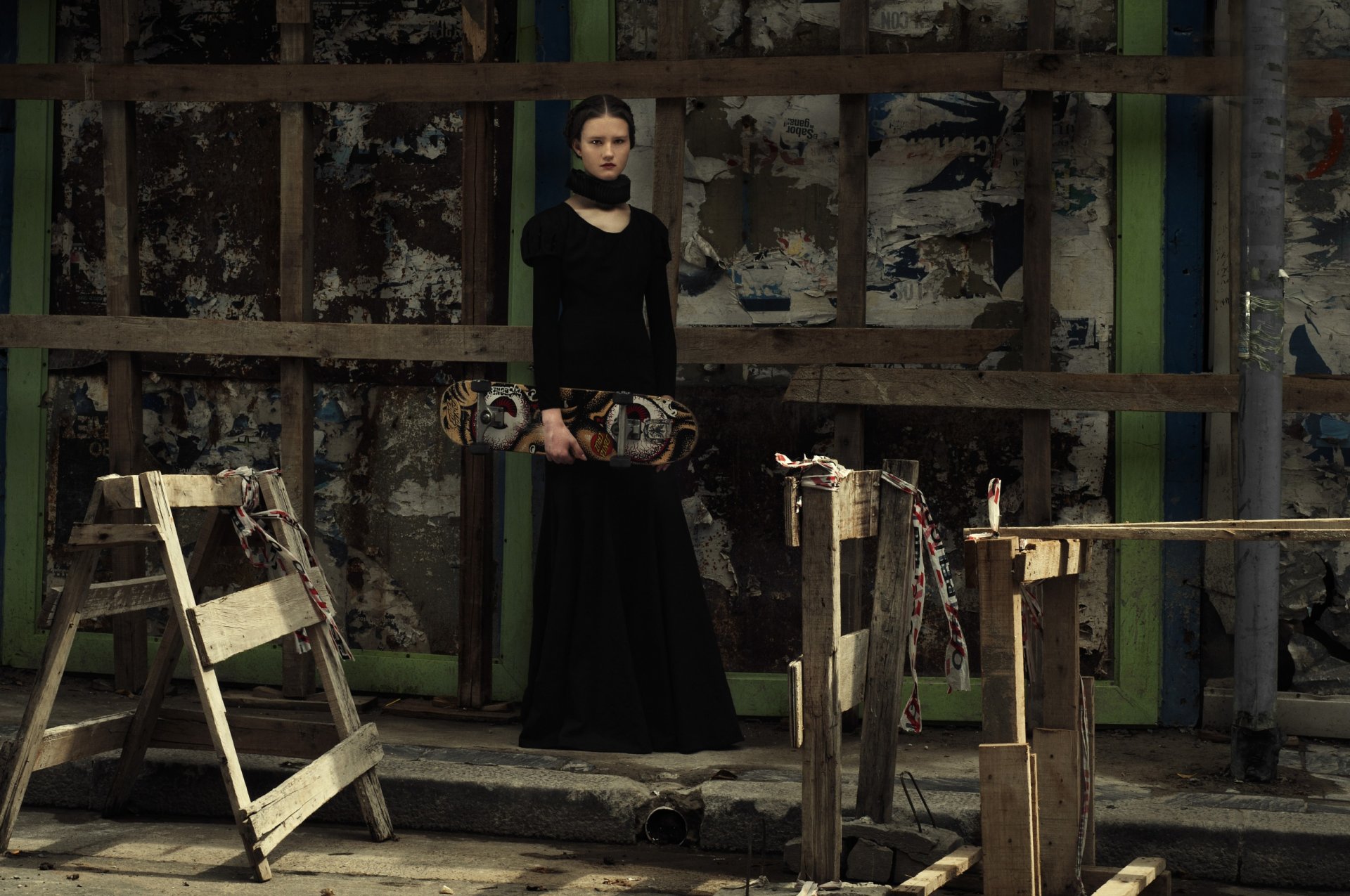 Chica en vestido negro con una patineta en sus manosChica en vestido negro con una patineta en sus manos