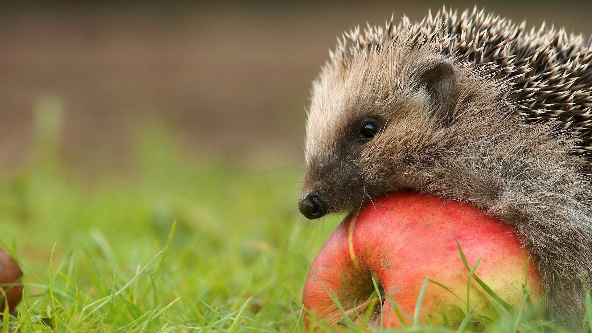 Sobre un fondo beige en el centro se encuentra un erizo con una manzana